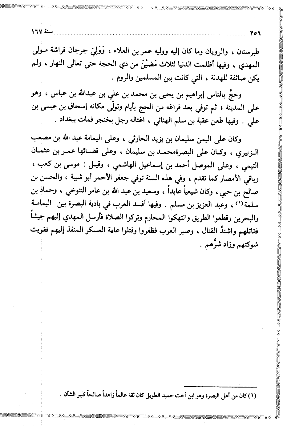 طبرستان والرويان وما كان إليه ووليه عمر بن العلاء وولي جرجان فراشة مولى المهدي وفيها أظلمت الدنيا لثلاث مضين من ذي الحجة حتى تعالى النهار ولم يكن صائفة للهدنة التي كانت بين المسلمين والروم