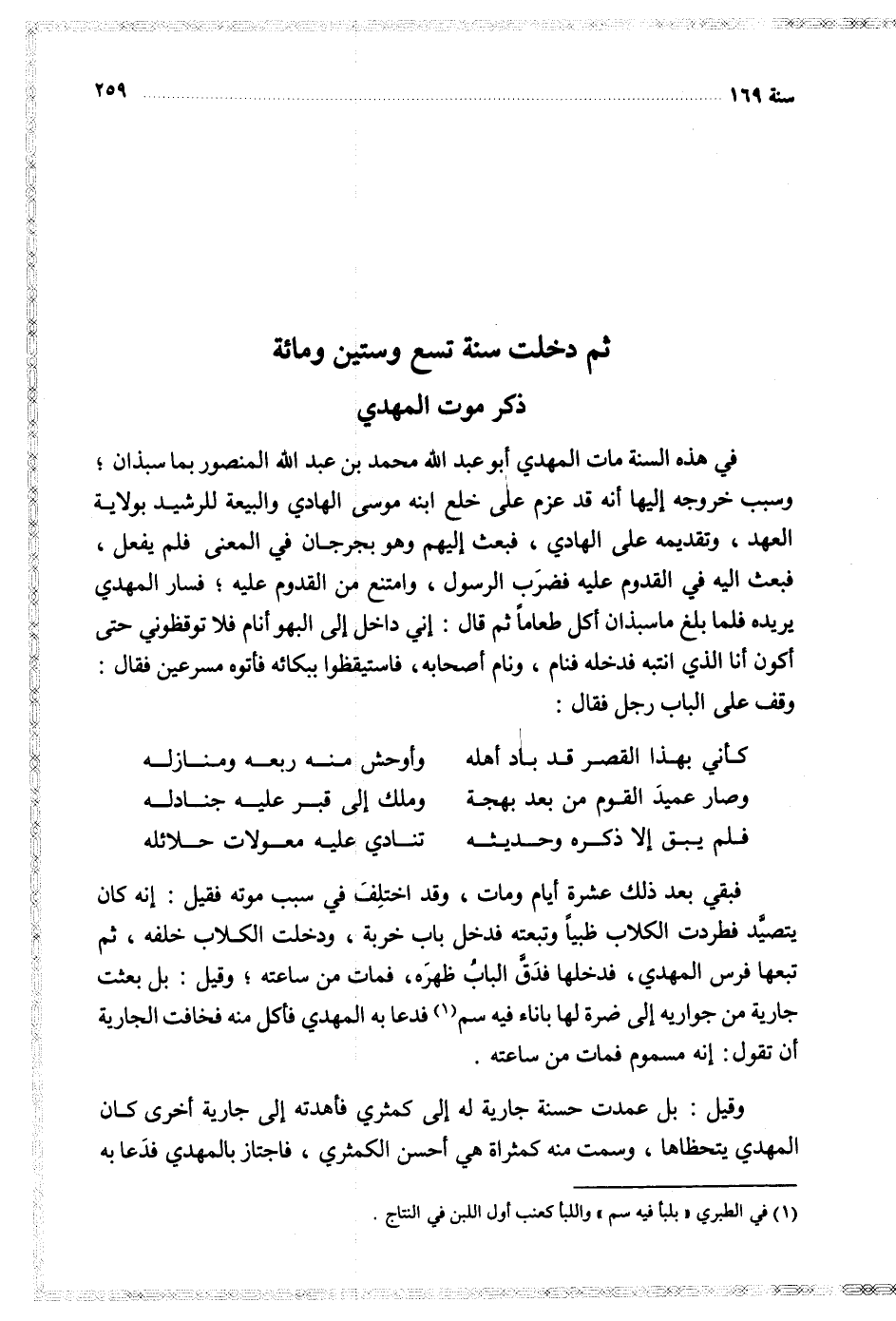 في هذه السنة مات المهدي أبو عبد الله محمد بن عبد الله المنصور بما سبذان وسبب خروجه إليها أنه قد عزم على خلع ابنه موسى الهادي والبيعة للرشيد بولاية العهد وتقدميه على الهادي فبعث إليهم وهو بجرجان في المعنى فلم يفعل فبعث إليه في القدوم عليه فضرب الرسول وامتنع من القدوم عليه فسار المهدي يريده فلما بلغ ماسبذان أكل طعاما ثم قال إني داخل إلى البهو أنام فلا توقظوني حتى أكون أنا الذي انتبه فدخله فنام ونام أصحابه فاستيقظوا ببكائه فأتوه مسرعين فقال وقف على الباب رجل فقال