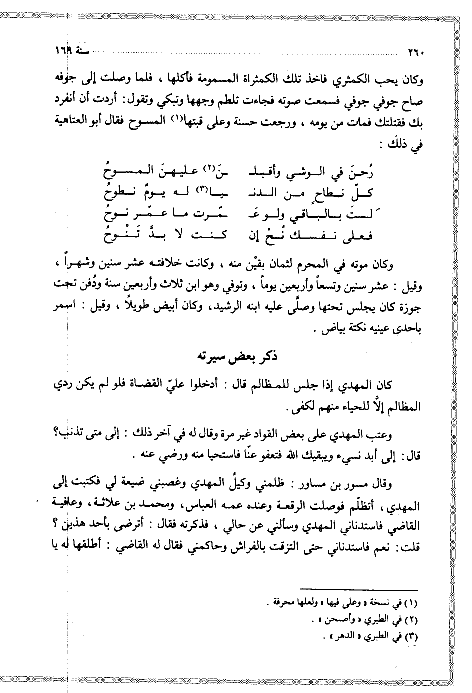 وكان يحب الكمثرى فاخذ تلك الكمثراة المسمومة فأكلها فلما وصلت إلى جوفه صاح جوفي جوفي فسمعت صوته فجاءت تلطم وجهها وتبكي وتقول أردت أن أنفرد بك فقتلتك فمات من يومه ورجعت حسنة وعلى قبتها المسوح فقال أبو العتاهية في ذلك