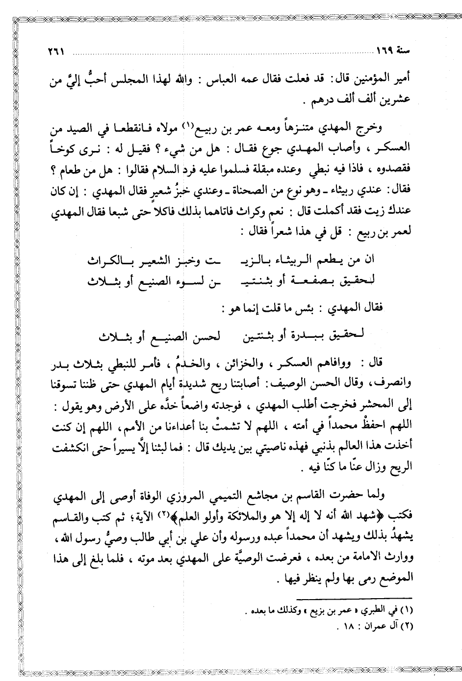 وخرج المهدي متنزها ومعه عمر بن ربيع مولاه فانقطعا في الصيد من العسكر وأصاب المهدي جوع فقال هل من شيء فقيل له نرى كوخا فقص دونه فإذا فيه نبطي وعنده مبقلة فسلموا عليه فرد السلام فقالوا هل من طعام فقال عندي ربيثاء وهو نوع من الصحناة وعندي خبز شعير فقال المهدي أن كان عندك زيت فقد أكملت قال نعم وكراث فاتاهما بذلك فأكلا حتى شبعا فقال المهدي لعمر بن ربيع قل في هذا شعرا فقال