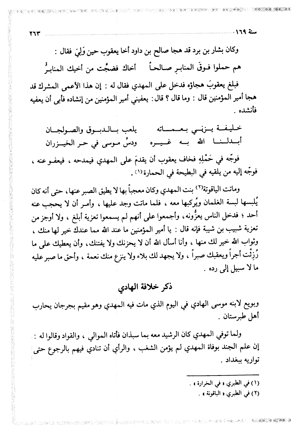 وماتت الياقونة بنت المهدي وكان معجبا بها لا يطيق الصبر عنها حتى أنه كان يلبسها لبسة الغلمان ويركبها معه فلما ماتت وجد عليها وأمر أن لا يحجب عنه أحد فدخل الناس يعزونه وأجمعوا على أنهم لم يسمعوا تعزية أبلغ ولا أوجز من تعزية شبيب بن شيبة فإنه قال يا أمير المؤمنين ما عند الله مما عندك خير لها منك وثواب الله خير لك منها وأنا أسأل الله أن يحزنك ولا فتنك وأن يعطيك على ما رزئت أجرا ويعقبك صبرا ولا يجهد لك بلاء ولا ينزع منك نعمة وأحق ما صبر عليه ما لا سبيل إلى رده