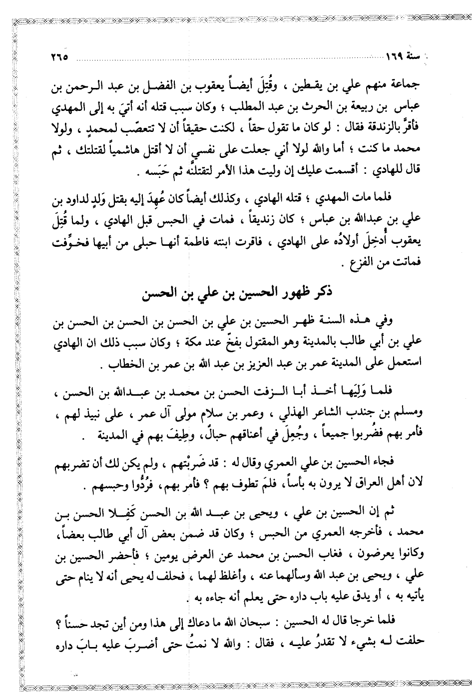 وفي هذه السنة ظهر الحسين بن علي بن الحسن بن الحسن بن الحسن بن علي بن أبي طالب بالمدينة وهو المقتول بفخ عند مكة وكان سبب ذلك أن الهادي استعمل على المدنية عمر بن عبد العزيز بن عبد الله بن عمر بن الخطاب