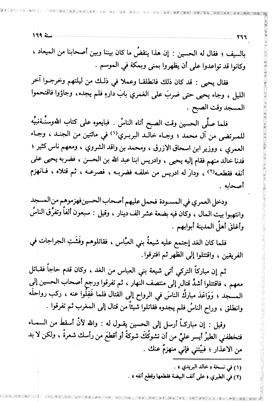 فبايعوه على كتاب الله وسنة نبيه للمرتضى من آل محمد وجاء خالد البربري في مائتين من الجند وجاء العمري ووزير ابن إسحاق الأزرق ومحمد بن واقد الشروي ومعهم ناس كثير فدنا خالد منهم فقام إليه يحيى وادريس ابنا عبد الله بن الحسن فضربه يحيى على أنفه فقطعه ودار له ادريس من خلفه فضربه فصرعه ثم قتلاه فانهزم أصحابه