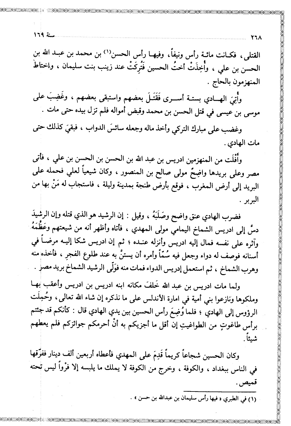 ولما مات ادريس بن عبد الله خلف مكانه ابنه ادريس بن ادريس وأعقب بها وملكوها ونازعوا بني أمية في إمارة الأندلس على ما نذكره أن شاء الله تعالى وحملت الرؤوس إلى الهادي فلما وضع رأس الحسين بين يدي الهادي قال كأنكم قد جئتم برأس طاغوت من الطواغيت أن أقل ما أجزيكم به أن أحرمكم جوائزكم فلم يعطهم شيئا