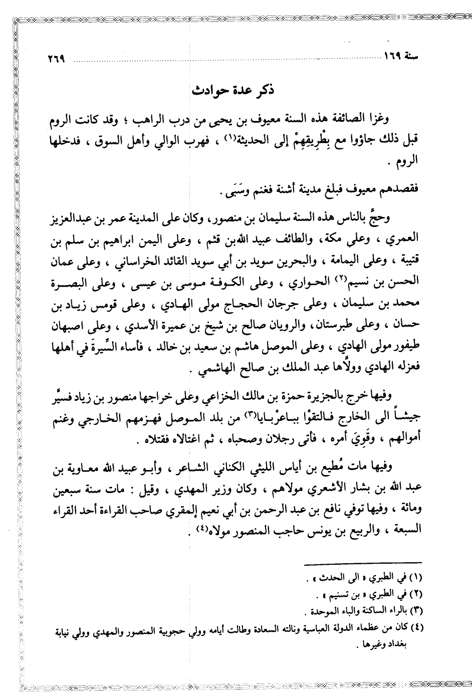 وحج بالناس هذه السنة سليمان بن منصور وكان على المدينة عمر بن عبد العزيز العمري وعلى مكة والطائف عبيد الله بن قثم وعلى اليمن إبراهيم بن سلم بن قتيبة وعلى اليمامة والبحرين سويد بن أبي سويد القائد الخراساني وعلى عمان الحسن بن نسيم الحواري وعلى الكوفة موسى بن عيسى وعلى البصرة محمد بن سليمان وعلى جرجان الحجاج مولى الهادي وعلى قومس زياد بن حسان وعلى طبرستان والرويان صالح بن شيخ بن عميرة الأسدي وعلى اصبهان طيفور مولى الهادي وعلى الموصل هاشم بن سعيد بن خالد فاساء السيرة في أهلها فعزله الهادي وولاها عبد الملك بن صالح الهاشمي
