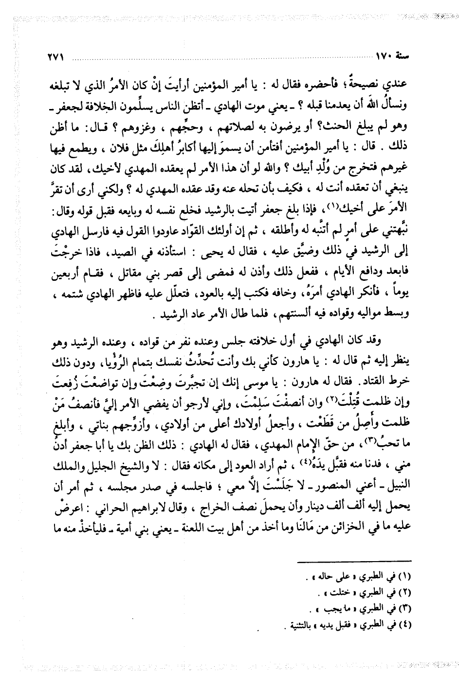 عندي نصيحة فأحضره فقال له يا أمير المؤمنين أرأيت أن كان الأمر الذي لا تبلغه ونسأل الله أن يعدمنا قبله يعني موت الهادي أتظن الناس يسلمون الخلافة لجعفر وهو لم يبلغ الحنث أو يرضون به لصلاتهم وحجهم وغزوهم قال ما أظن ذلك