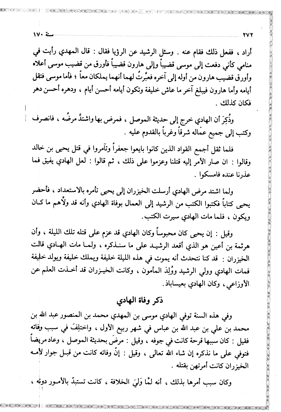 وفي هذه السنة توفي الهادي موسى بن المهدي محمد بن المنصور عبد الله بن محمد بن علي بن عبد الله بن عباس في شهر ربيع الأول واختلف في سبب وفاته فقيل كان سببها قرحة كانت في جوفه وقيل مرض بحديثة الموصل وعاد مريضا فتوفي على ما نذكره أن شاء الله تعالى وقيل أن وفاته كانت من قبل جوار لأمه الخيزران كانت أمرتهن بقتله