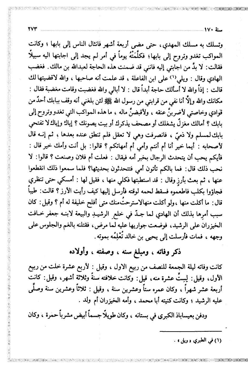 فغضب الهادي وقال ويلي على ابن الفاعلة قد علمت أنه صاحبها والله لاقضيتها لك قالت إذا والله لا أسألك حاجة أبدا قال لا أبالي والله فغضبت وقامت مغضبة فقال مكانك والله والا أنا نفي من قرابتي من رسول الله لئن بلغني أنه وقف ببابك أحد من قوادي وخاصتي لأضربن عنقه ولأقبضن ماله ما هذه المواكب التي تغدو وتروح غلى بابك أمالك مغزل يشغلك أو مصحف يذكرك أو بيت يصونك إياك وإياك لا تفتحي بابك لمسلم ولا ذمي فانصرفت وهي لا تعقل فلم تنطق عنده بعدها ثم انه قال لأصحابه أيما خير أنا أم أنتم وأمي أمهاتكم قالوا بل أنت وأمك خير قال فأيكم يجب أن يتحدث الرجال بخبر أمه فيقال فعلت أم فلان وصنعت قالوا لا نحب ذلك قال فما بالكم تأتون أمي فتتحدثون بحديثها فلما سمعوا ذلك انقطعوا عنها ثم بعث بأرز وقال قد استطبتها فكلي منها فقيل لها أمسكي حتى تنظري فجاؤوا بكلب فاطمعوه فسقط لحمه لوقته فأرسل إليها كيف رأيت الأرز قالت طيبا قال ما أكلت منها ولو أكلت منها لاسترحت منك متى أفلح خليفة له أم وقيل كان سبب أمرها بذلك أن الهادي لما جد في خلع الرشيد والبيعة لابنه جعفر خافت الخيزران على الرشيد فوضعت جواريها عليه لما مرض فقتلنه بالغم والجلوس على وجهه فمات فأرسلت إلى يحيى بن خالد تعلمه بموته