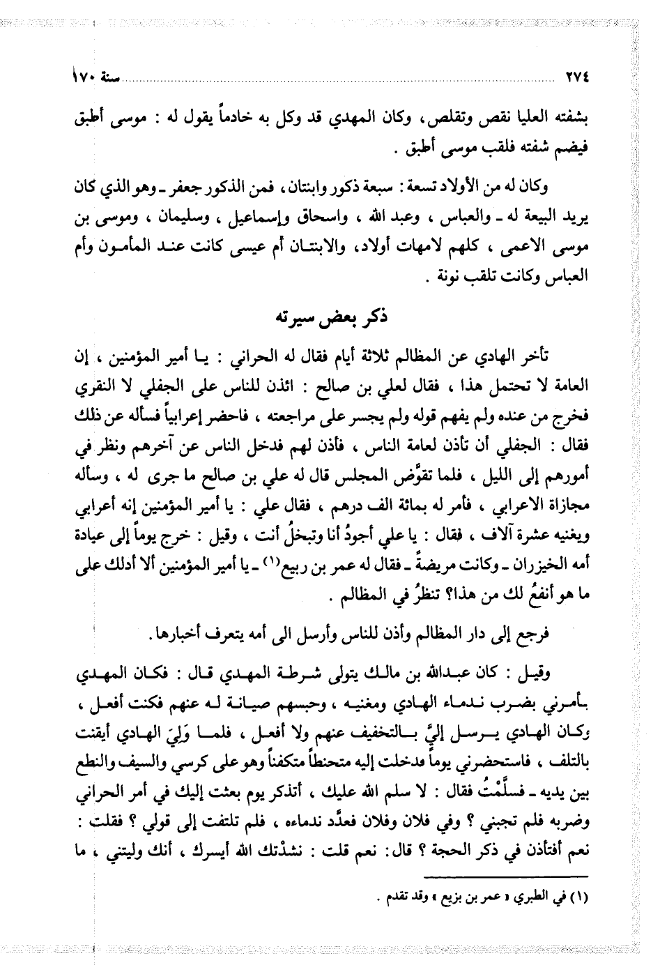 الأخر الهادي عن المظالم ثلاثة أيام فقال له الحراني يا أمير المؤمنين أن العامة لا تحتمل هذا فقال لعلي بن صالح ائذن للناس على الجفلى لا النقري فخرج من عنده ولم يفهم قوله ولم يجسر على مراجعته فاحضر إعرابيا فسأله عن ذلك فقال الجفلي أن تأذن لعامة الناس فأذن لهم فدخل الناس عن آخرهم ونظر في أمورهم إلى الليل فلما تقوض المجلس قال له علي بن صالح ما جرى له وسأله مجازاة الأعرابي فأمر له بمائة ألف درهم فقال علي يا أمير المؤمنين إنه أعرابي ويغنيه عشرة آلاف فقال يا علي أجود أنا وتبخل أنت وقيل خرج يوما إلى عيادة أمه الخيزران وكانت مريضة فقال له عمر بن الربيع يا أيمر المؤمنين إلا أدلك على ما هو أنفع لك من هذا تنظر في المظالم