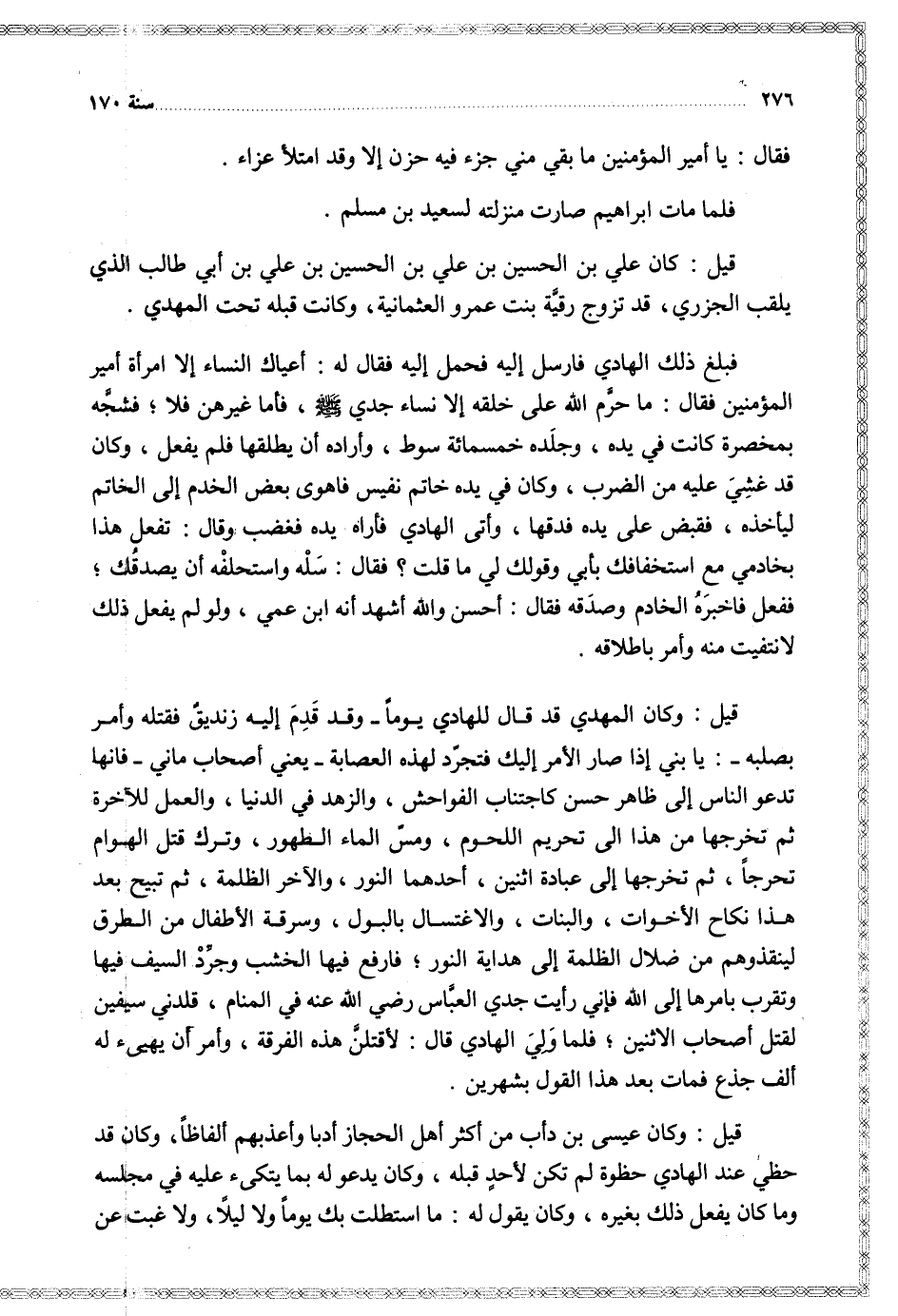 قيل وكان المهدي قد قال للهادي يوما وقد قدم إليه زنديق فقتله وأمر بصلبه يا بني إذا صار الأمر إليك فتجرد لهذه العصابة يعني أصحاب ماني فانها تدعو الناس إلى ظاهر حسن كاجتناب الفواحش والزهد في الدنيا والعمل للآخرة ثم تخرجها من هذا إلى تحريم اللحوم ومس الماء الطهور وترك قتل الهوام تحرجا ثم تخرجها إلى عبادة اثنين أحدهما النور والأخر الظلمة ثم تبيح بعد هذا نكاح الأخوات والبنات والاغتسال بالبول وسرقة الأطفال من الطرق لينقذوهم من ضلال الظلمة إلى هداية النور فارفع فيها الخشب وجرد السيف فيها وتقرب بأمرها إلى الله فإني رأيت جدي العباس رضي الله عنه في المنام قلدني سيفين لقتل أصحاب الاثنين فلما ولي الهادي قال لأقتلن هذه الفرقة وأمر أن يهيئ له ألف جذع فمات بعد هذا القول بشهرين