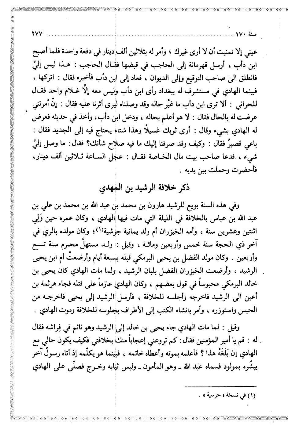 وفي هذه السنة بويع للرشيد هارون بم محمد بن عبد الله بن محمد بن علي بن عبد الله بن عباس بالخلافة في الليلة التي مات فيها الهادي وكان عمره حين ولى اثنتين وعشرين سنة وأمه الخيزران أم ولد يمانية جرشية وكان مولده بالري في آخر ذي الحجة سنة خمس وأربعين ومائة وقيل ولد مستهل محرم سنة تسعه واربعين