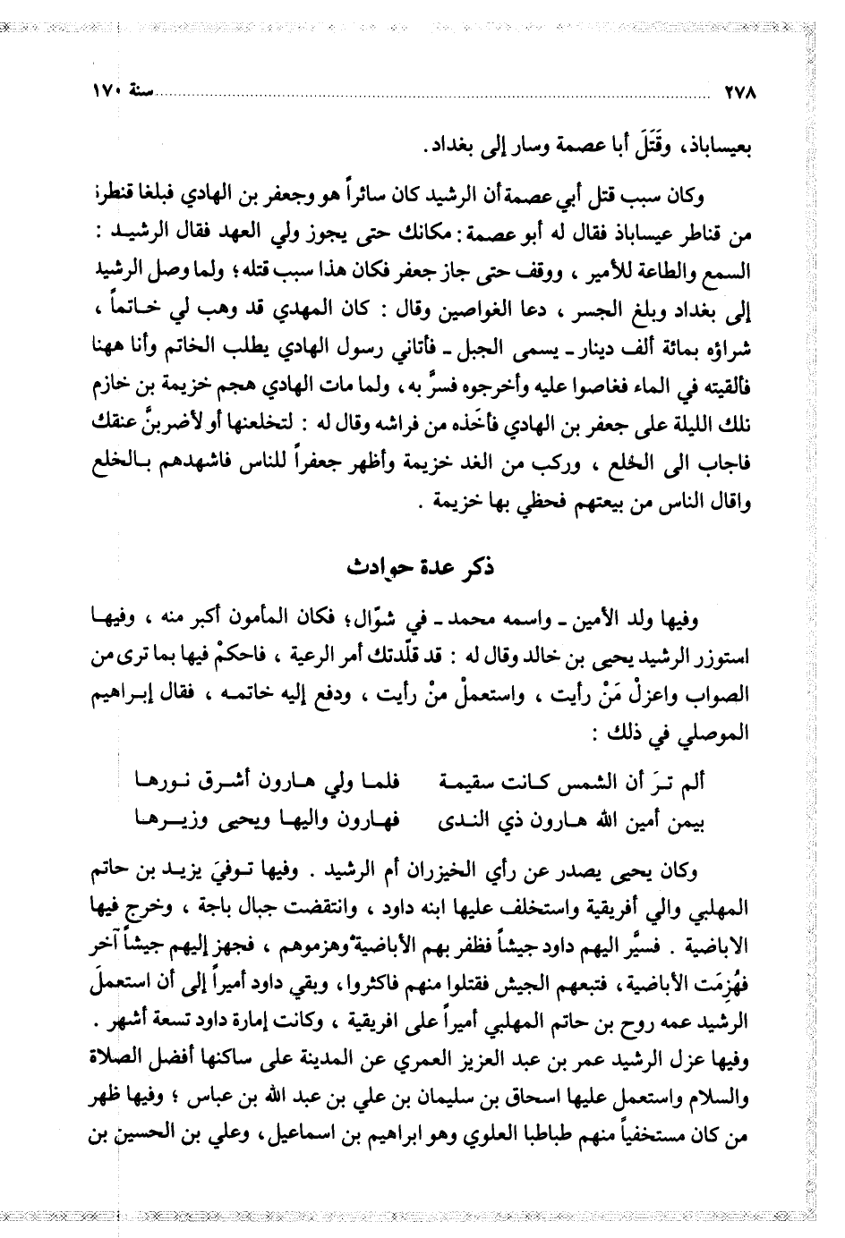 وفيها ولد الأمين واسمه محمد في شوال فكان المأمون أكبر منه وفيها استوزر الرشيد يحيى بن خالد وقال له قد قلدتك أمر الرعية فاحكم فيها بما ترى من الصواب واعزل من رأيت واستعمل من رأيت ودفع إليه خاتمه فقال إبراهيم الموصلي في ذلك