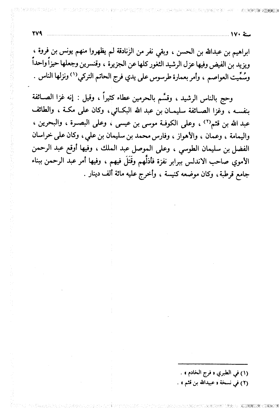 إبراهيم بن عبد الله بن الحسن وبقي نفر من الزنادقة لم يظهروا منهم يونس بن فروة ويزيد بن الفيض وفيها عزل الرشيد الثغور كلها عن الجزيرة وقنسرين وجعلها حيزا واحدا وسميت العواصم وأمر بعمارة طرسوس على يدي فرج الحاتم التركي ونزلها الناس