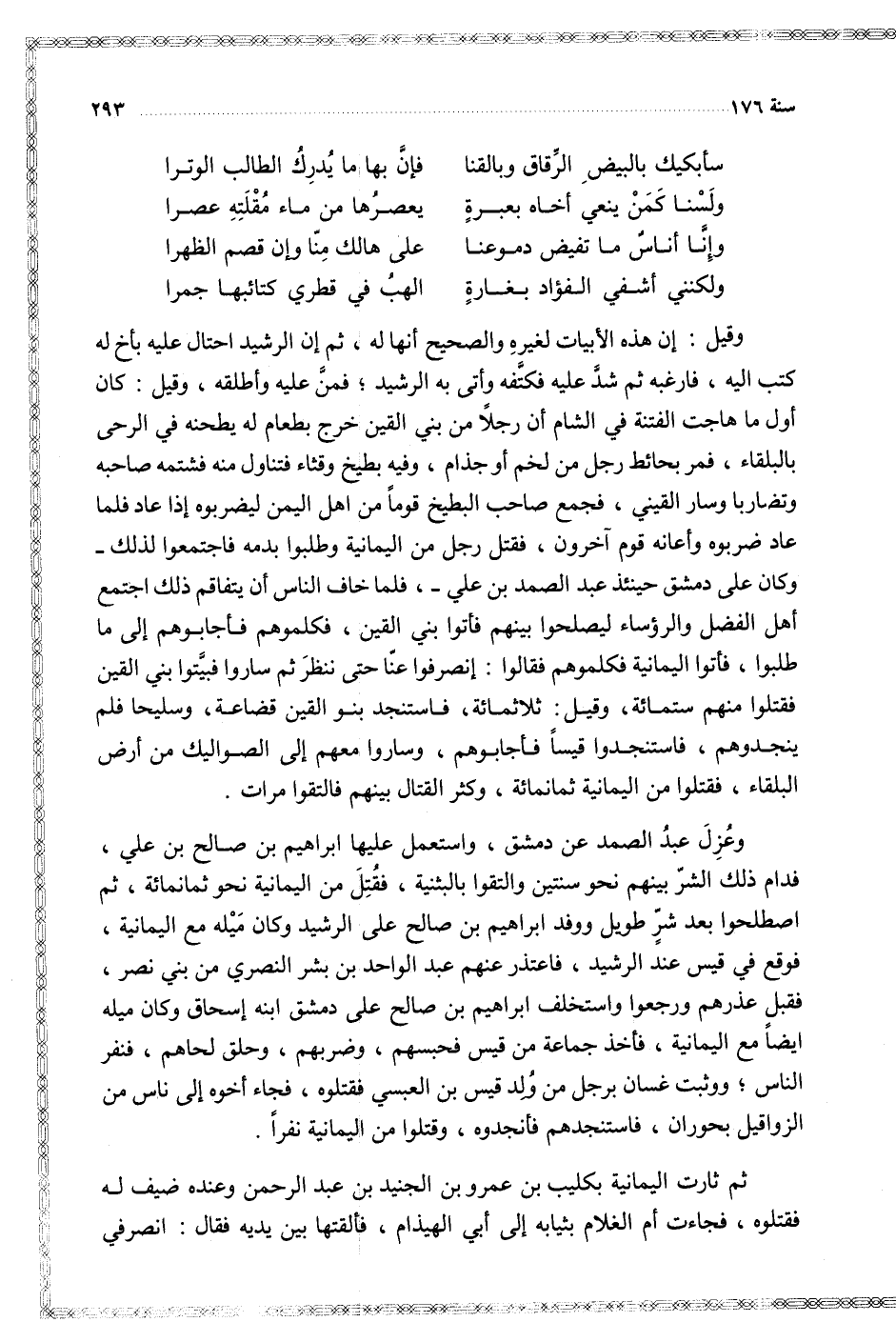 وقيل أن هذه الأبيات لغيره والصحيح أنها له ثم أن الرشيد احتال عليه بأخ له كتب إليه فارغبه ثم شد عليه فكتفه وأتى به اللاشيد فمن عليه وأطلقه وقيل كان أول ما هاجت الفتنة في الشام أن رجلا من بني القين خرج بطعام له يطحنه في الرحى بالبلقاء فمر بحائط رجل من لخم أو جذام وفيه بطيخ وقثاء فتناول منه فشتمه صاحبه وتضاربا وسار القيني فجمع صاحب البطيخ قوما من أهل اليمن ليضربوه إذا عاد فلما عاد ضربوه وأعانه قوم آخرون فقتل رجل من اليمانسة وطلبوا بدمه فاجتمعوا لذلك وكان على دمشق حينئذ عبد الصمد بن علي فلما خاف الناس أن يتفاقم ذلك اجتمع أهل الفضل والرؤساء ليصلحوا بينهم فأتوا بني القين فكلموهم فأجأبوهم إلى ما طلبوا فأتوا اليمانية فكلموهم فقالوا انصرفوا عنا حتى ننظر ثم ساروا فبيتوا بني القين فقتلوا منهم ستمائة وقيل ثلاثملئة فاتسنجد بنو القين قضاعة وسليحا فلم ينجدوهم فاستنجدوا قيسا فأجأبوهم وساروا معهم إلى الصواليك من أرض البلقاء فقتلوا من اليمانية ثمانمائة وكثر القتال بينهم فالتقوا مرات