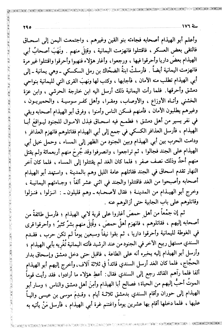 فلما رأت اليمانية ذلك أرسل إليه ابن خارجة الحرشي وابن عزة الخشني وأتاه الأوزاع والأوصاب ومقرا وأهل كفر سوسية والحميريون وغيرهم يطلبون الأمان فأمنهم فسكن الناس وأمنوا وفرق أبو الهيذام أصحابه وبقي في نفر يسير من أهل دمشق فطمع فيه إسحاق فبذل الأموال للجنود ليواقع أبا الهيذام فأرسل العذافر الكسكي في جمع إلى أبي الهيذام فقاتلوهم فانزهم العذافر ودامت الحرب بين أبي الهيذام وبين الجنود من الظهر إلى المساء وحمل خيل أبي الهيذام على الجند فجالوا ثم تراجعوا وانصرفوا وقد جرح منهم أربعمائة ولم يقتل منهم أحد وذلك نصف صفر فلما كان الغد لم يقتتلوا إلى المساء فلما كان آخر النهار تقد إسحاق في الجند فقاتلهم عامة الليل وهم بالمدينة واستمد أبو الهيذام أصحابه وأصبحوا من الغد فاقتتلوا والجند في اثني عشر ألفا وجاءتهم اليمانية وخرج أبو الهيذام من المدينة فقال لأصحابه وهم قليلون انزلوا فنزلوا وقاتلوهم على باب الجابية حتى أزالوهم عنه