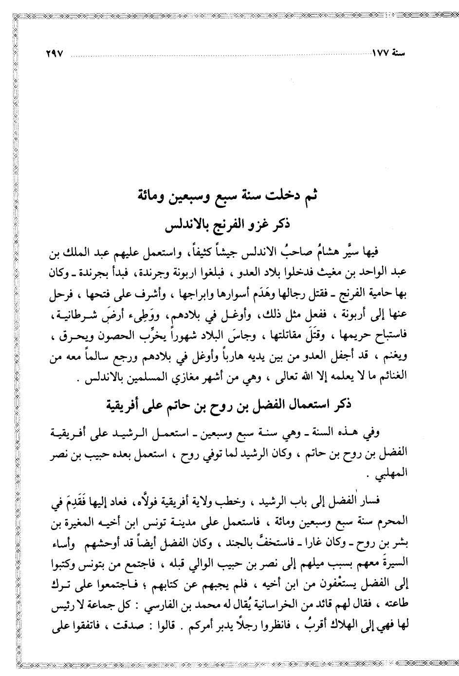 وفي هذه السنة وهي سنة سبع وسبعين استعمل الرشيد على أفريقية الفضل بن روح بن حاتم وكان الرشيد لما توفى روح استعمل بعده حبيب بن نصر المهلبي