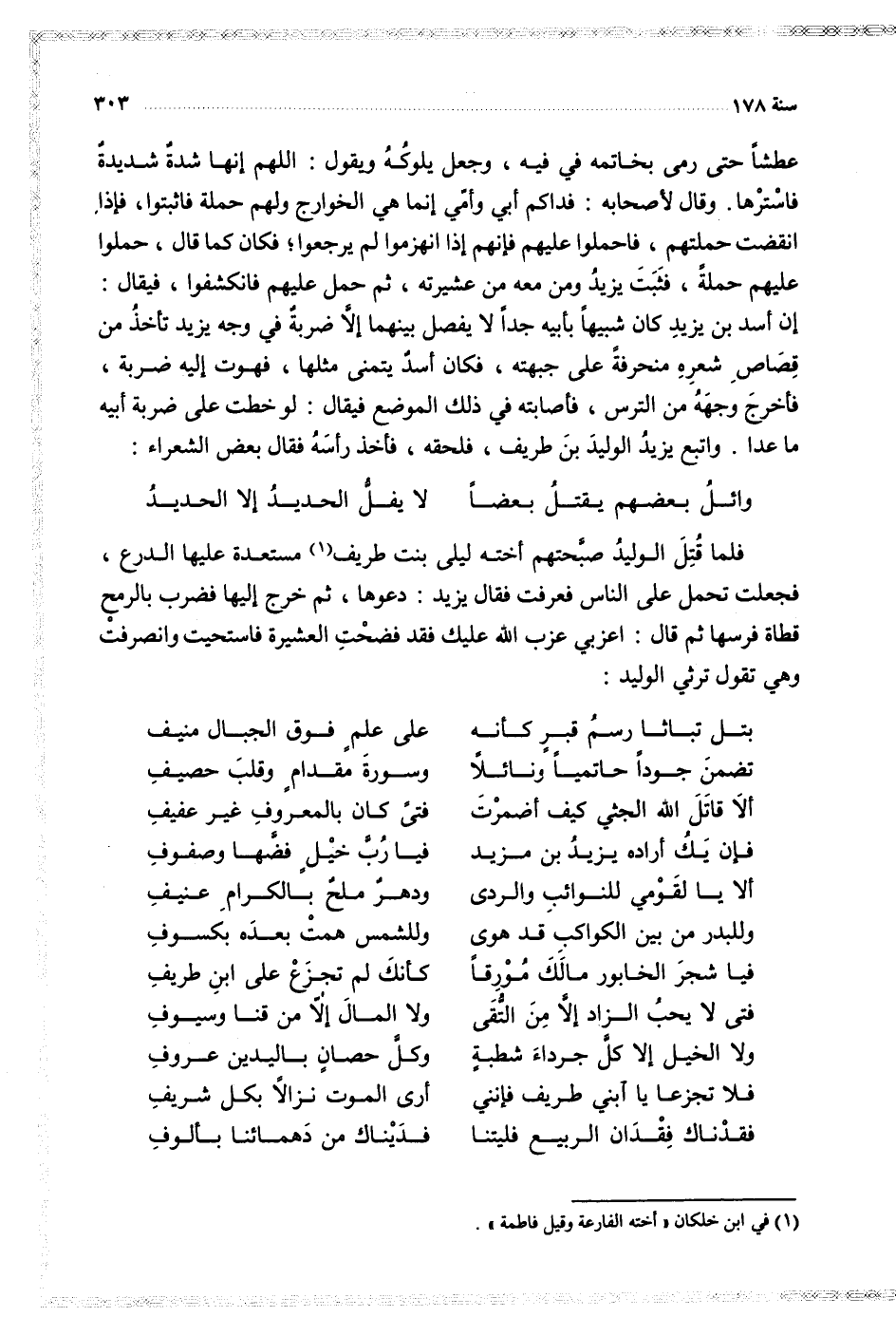 فلما قتل الوليد صبحتهم أخته ليلى بنت طريف مستعدة عليها الدرع فجعلت تحمل على الناس فعرفت فقال يزيد دعوها ثم خرج إليها فضرب بالرمح قطاة فرسها ثم قال اعزبي الله عليك فقد فضحت العشيرة فاستحيت وانصرفت وهي تقول ترثي الوليد