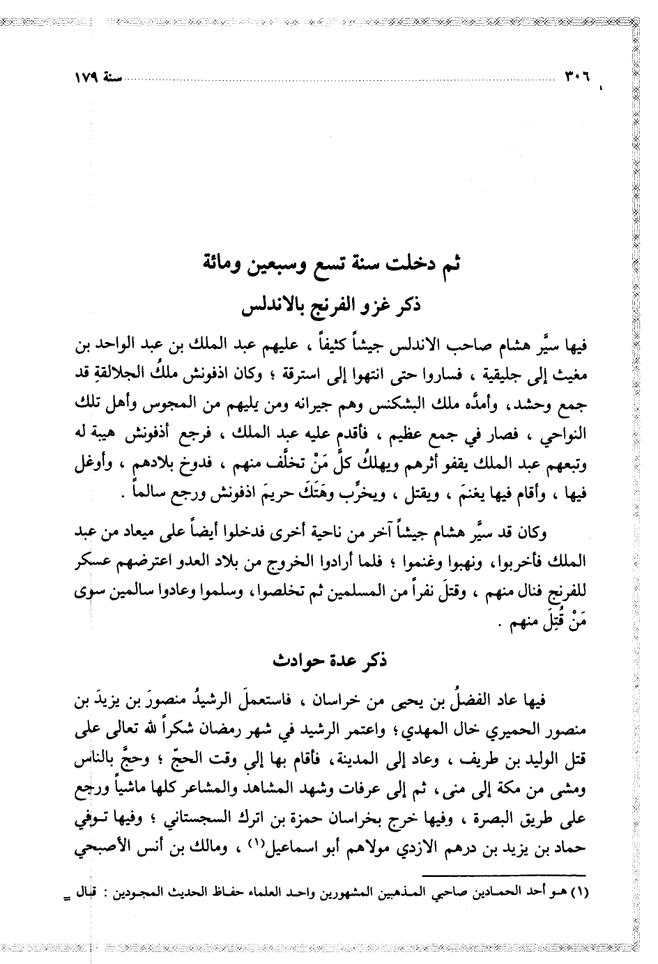 فيها عاد الفضل بن يحيى من خراسان فاستعمل الرشيد منصور بن يزيد بن منصور الحميري خال المهدي واعتمر الرشيد في شهر رمضان شكرا لله تعالى على قتل الوليد بن طريف وعاد إلى المدينة فأقام بها إلى وقت الحج وحج بالنااس ومشى مكة إلى منى ثم إلى عرفات وشهد المشاهد والمشاعر كلها ماشيا ورجع على طريق البصرة وفيها خرج بخراسان بحمزة بن اترك السجستاني وفيها توفي حماد بن يزيد بن درهم الازدي مولاهم أبو إسماعيل ومالك بن أنس الأصبحي