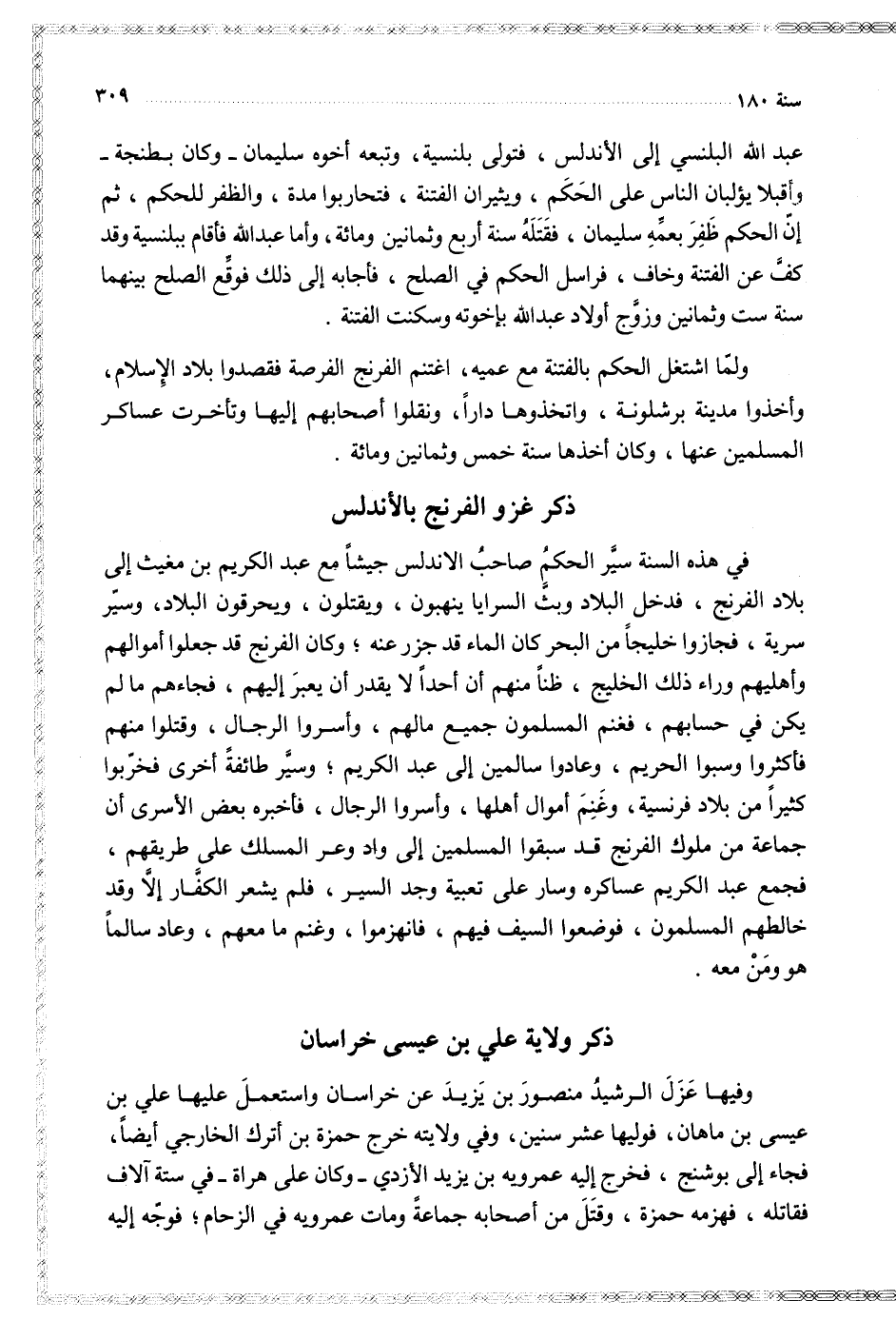 في هذه السنة سير الحكم صاحب الأندلس جيشا مع عبد الكريم بن مغيث إلى بلاد الفرنج فدخل البلاد السرايا ينهبون ويقتلون ويحرقون البلاد وسير سرية فجازوا خليجا من البحر كان الماء قد جزر عنه وكان الفرنج قد جعلوا أموالهم وأهليهم وراء ذلك الخليج ظنا منهم أن أحدا لا يقدر أن يعبر إليهم فجاءهم ما لم يكن في حسابهم فغنم المسلمون جميع مالهم وأسروا الرجال وقتلوا منهم فأكثروا وسبوا الحريم وعادوا سالمين إلى عبدالكريم وسير طائفة ئأخرى فخربوا كثيرا من بلاد فرنسية وغنم أموال أهلها وأسروا الرجال فأخبره بعض الأسرى أن جماعة من ملوك الفرنج قد شبقوا المسلمين إلى واد وعر المسلك على طريقهم فجمع عبد الكريم عساكره وسار على تعبية وجد السير فلم يشعر الكفار إلا وقد خالطهم المسلمون فوضعوا السيف فيهم فانهزموا وغنم ما معهم وعاد سالما هو ومن معه