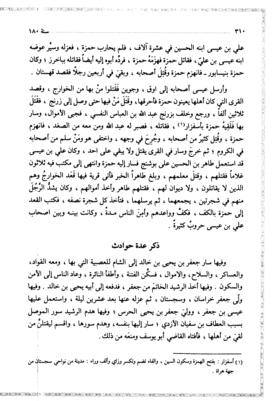 وأرسل عيسى أصحابه إلى أوق وجوين فقتلوا من بها من الخوارج وقصد القرى التي كان أهلها يعينون حمزة فأحرقها وقتل من فيها حتى وصل إلى زرنج فقتل ثلاثين ألفا ورجع وخلف برزنج عبد الله بن العباس النفسي فجبى الأموال وسار بها فلقيه حمزة بأسفزار فقاتله فصبر له عبد الله ومن معه من الصغد فانهزم حمزة وقل كثير من أصحابه وجرح في وجهه واختفى هو ومن سلم من أصحابه في الكروم ثم خرج وسار في القرى يقتل ولا يبقى على احد وكان علي بن عيسى قج استعمل طاهر بن الحسين على بوشنج فسار إليه حمزة وانتهى إلى مكتب فيه ثلاثون غلاما فقتلهم وقتل معلمهم وبلغ طاهرا الخبر فأتى قرية فيها وقعد الخوارج وهم الذين لا يقاتلون ولا يوان لهم فقتلهم طاهر وأخذ أموالهم وكان يشد الرجل منهم في شجرتين يجمعهما ثم يرسلهما فتأخذ كل شجرة نصفه فكتب القعد إلى حمزة بالكف فكف وواعدهم وأمن الناس مدة وكانت بينه وبين أصحاب علي بن عيسى حروب كثيرة