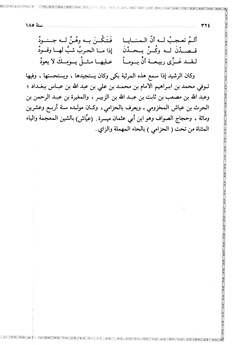 وكان الرشيد إذا سمع هذه المرثية بكى وكان يستجيدها ويستحسنها وفيها توفي محمد بن إبراهيم الامام بن محمد بن علي بن عبد الله بن عباس ببغداد وعبد الله بن مصعب بن ثابت بن عبد الله بن الزبير والمغيرة بن عبد الرحمن بن الحرث بن عياش المخزومي ويعرف بالحزامى وكان مولده سنة أربع وعشرين ومائة وحجاج الصواف وهو ابن أبي عثمان ميسرة