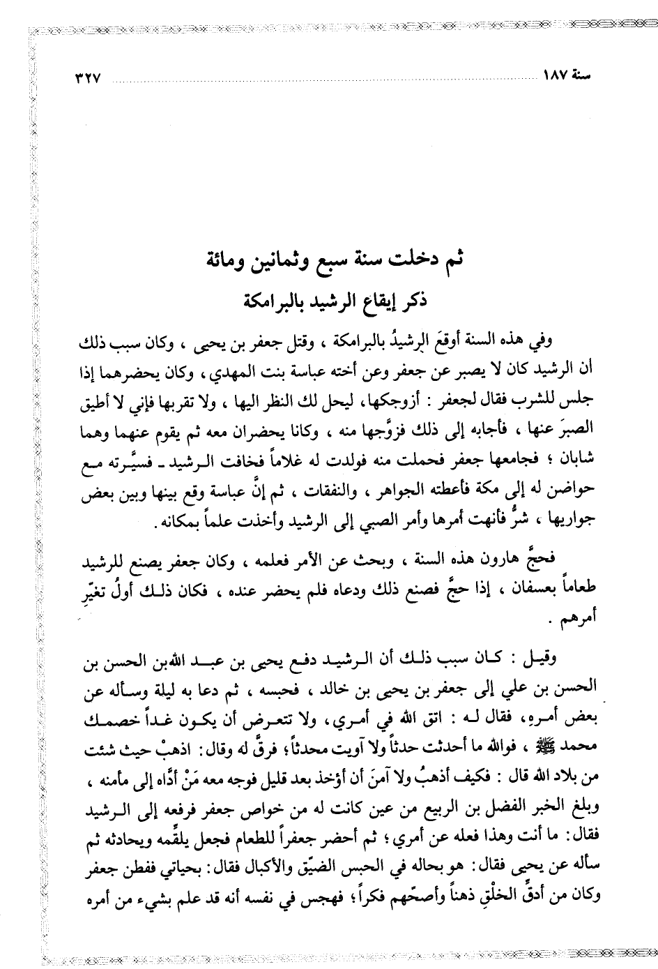 وفي هذه السنة أوقع الرشيد بالبرامكة وقتل جعفر بن يحيى وكان سبب ذلك أن الرشيد كان لا يصبر عن جعفر وعن أخته عباسة بنت المهدي وكان يحضرهما إذا جلس للشرب فقال لجعفر أزوجكها ليحل لك النظر اليها ولا تقربها فإني لا أطيق الصبر عنها فأجابه إلى ذلك فزوجها منه وكانا يحضران معه ثم يقوم عنهما وهما شابان فجامعهما جعفر فحملت منه فولدت له غلاما فخافت الرشيد فسيرته مع حواضن له إلى مكة فأعطته الجواهر والنفقات ثم إن عباسة وقع بينها وبين بعض جواريها شر فأنهت أمرها وأمر الصبي إلى الرشيد وأخذت علما بمكانه