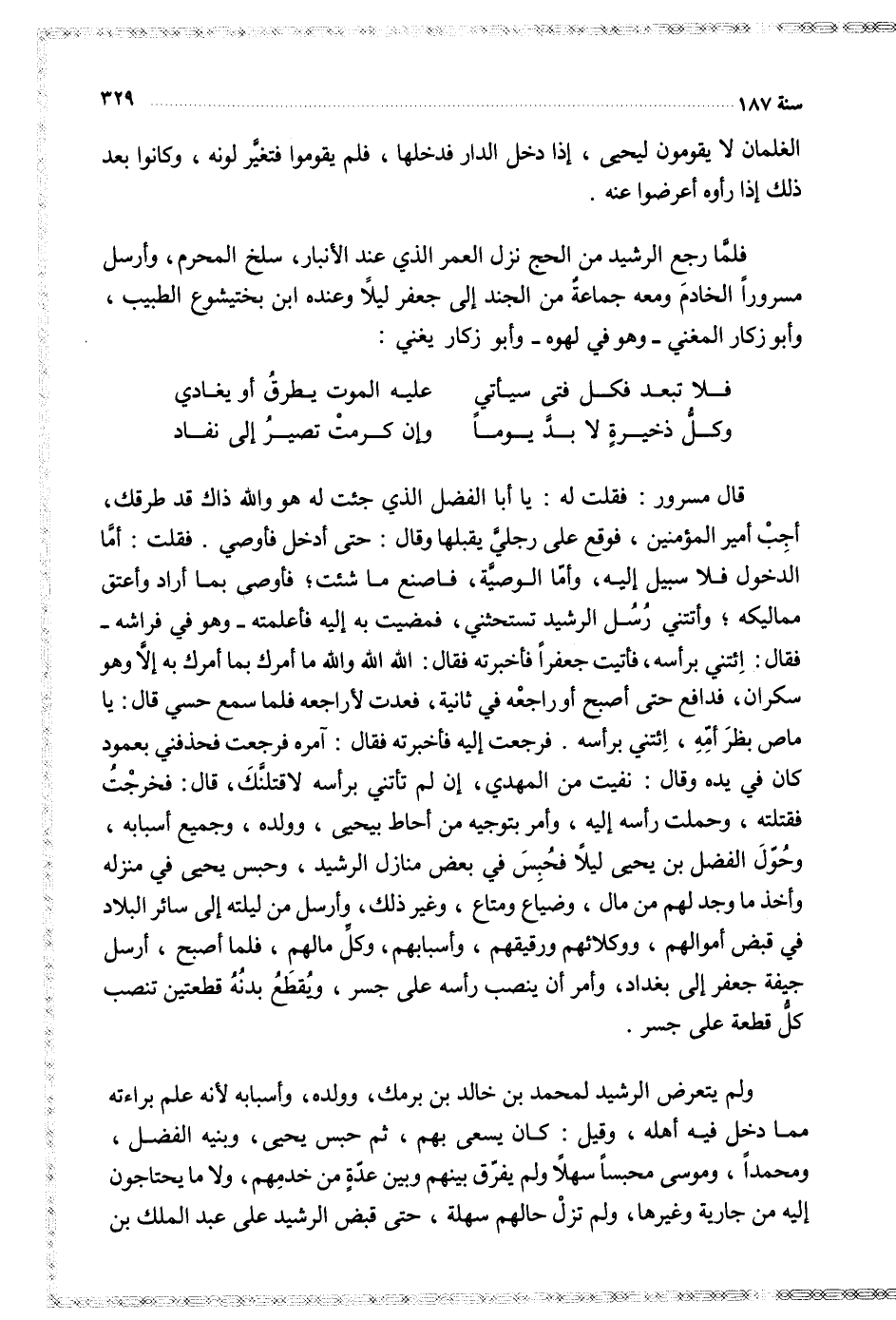 فلما رجع الرشيد من الحج نزل العمر الذي عند الأنبار سلخ المحرم وأرسل مسرورا الخادم ومعه جماعة من الجند إلى جعفر ليلا وعنده ابن بختيشوع الطبيب وأبو زكار المغني وهو في لهوه وابو زكار يغني