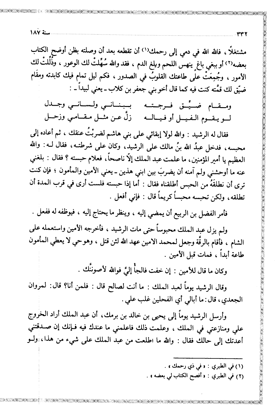 مشتغلا فالله الله في دمي إلى رحمك أن تقطعه بعد أن وصلته بظن أوضح الكتاب بعضه أو ببغي باغ ينهس اللحم ويلغ الدم فقد والله سهلت لك والأعور وذللت لك الأمور وجمعت على طاعتك القلوب في الصدور فكم ليل تمام فيك كابدته ومقام ضيق قمته كنت فيه كما قال أخو بني جعفر بن كلاب يعني لبيدا