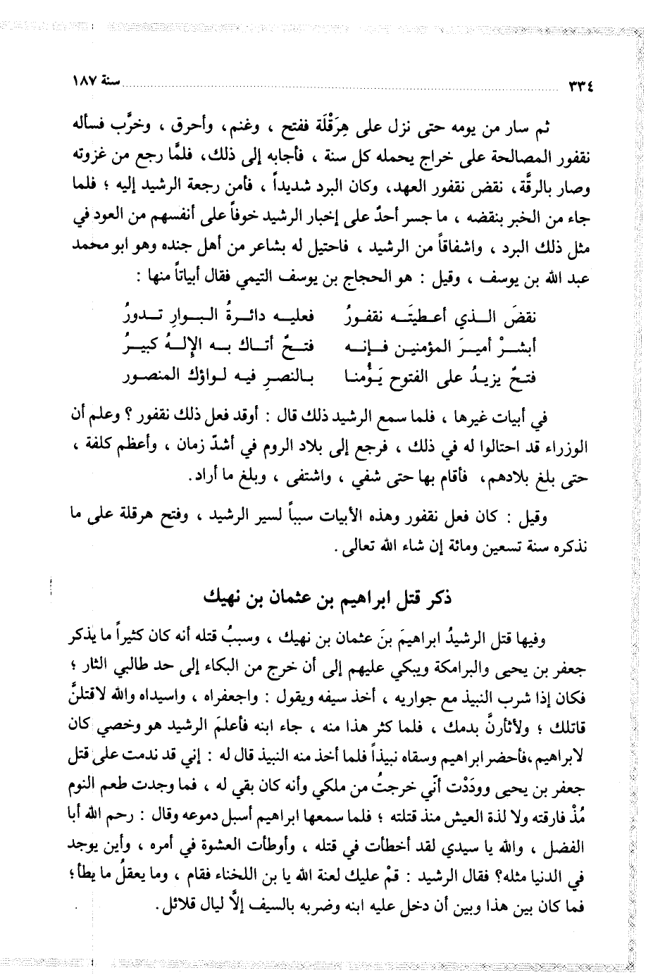 وفيها قتل الرشيد إبراهيم بن عثمان بن نهيك وسبب قتله أنه كان كثيرا ما يذكر جعفر بن يحيى والبرامكة ويبكي عليهم إلى أن خرج من البكاء إلى حد طالبي الثار فكان إذا شرب النبيذ مع جواريه أخذ سيفه ويقول واجعفراه واسيداه والله لأقتلن قاتلك ولأثأرن بدمك فلما كثر هذا منه داء ابنه فأعلم الرشيد هو وخصي كان لاإبراهيم فأحضر إبراهيم وسقاه النبيذ فلما أخذ منه النبيذ قال له إني قد ندمت على قتل جعفر بن يحيى وودت أني خرجت من ملكي وأنه كان بقي له فما وحدت طعن النوم مذ فارقته ولا لذة العيش منذ قتلته فلما سمعها إبراهيم أسبل دموعه وقال رحم الله أبا الفضل والله يا سيدي لقد أخطأت في قتله وأوطأت العشوة في أمره وأين توجد في الدنيا مثله فقال الرشيد قم عليك لعنة الله يا بن اللخناء فقام وما يعقل ما يطأ فما كان بين هذا وبين أن دخل عليه ابنه وضربه بالسيق إلا ليال قلائل