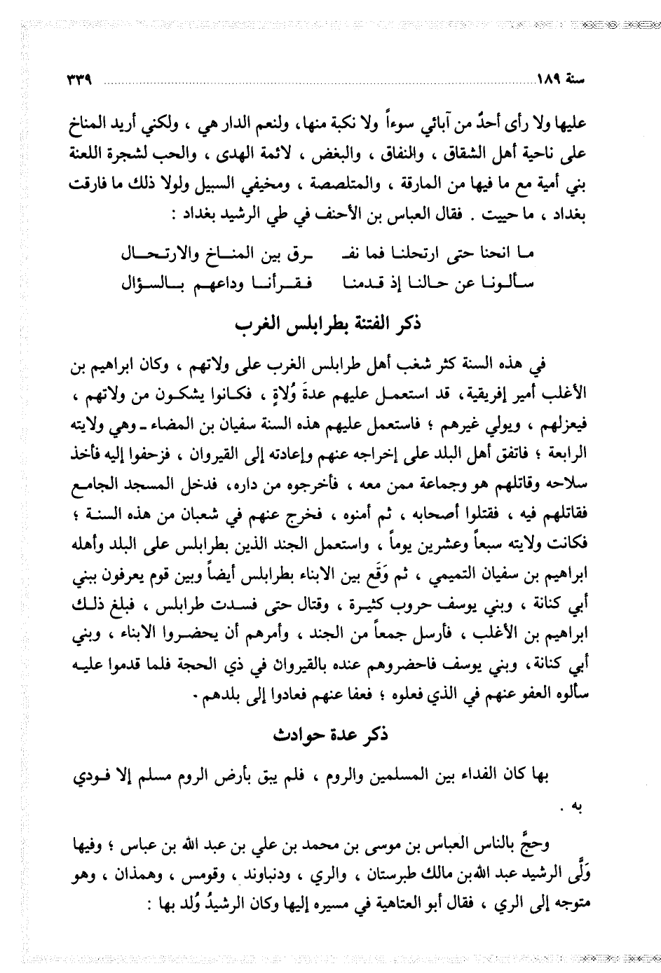 وحج بالناس العباس بن موسى بن محمد بن علي بن عبد الله بن عباس وفيها ولي الرشيد عبد الله بن مالك طبرستان والري ودنباوند وقومس وهمذان وهو متوجه إلى الري فقال أبو العتاهية في مسيره إليها وكان الرشيد ولد بها