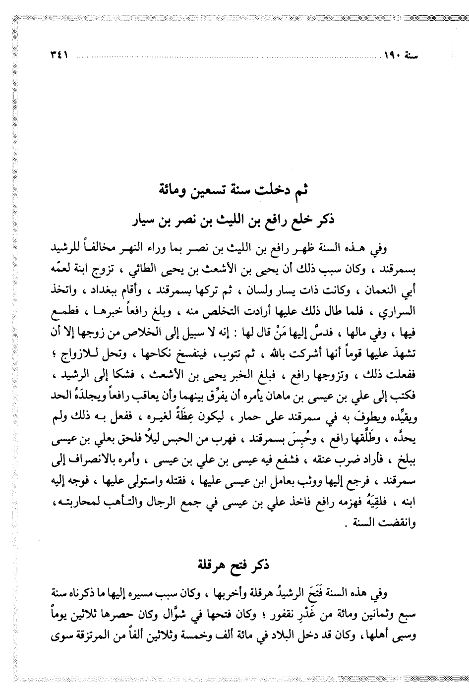 وفي هذه السنة ظهر رافع بن الليث بن نصر بما وراء النهر مخالفا للرشيد بسمرقند وكان سبب ذلك أن يحيى بن الأشعث بن يحيى الطائي تزوج ابنة لعمه أبي النعمان وكانت ذات يسار ولسان ثم تركها بسمرقند وأقام ببغداد واتخذ السراري فلما طال ذلك عليها أرادت التخلص منه وبلغ رافعا خبرها فطمع فيها وفي مالها فدس إليها من قال لها إنه لا سبيل إلى الخلاص من زوجها إلا أنت تشهد عليها قوما أنها أشركت بالله ثم تتوب فينفسخ نكاحها وتحل للازواج ففعلت ذلك وتزوجها رافع فبلغ الخبر يحيى بن الأشعث فشكا إلى الرشيد فكتب إلى علي بن عيسى بن ماهان يأمره أن يفرق بينهما وأن يعاقب رافعا ويجلده الحد ويقيده ويطوف به في سمرقند على حمار ليكون عظة لغيره ففعل به ذلك ولم يحده فأراد ضرب عنقه فشفع فيه عيسى بن علي بن عيسى وأمره بالانصراف إلى سمرقند فرجع إليها ووثب بعامل ابن عيسى عليها فقتله واستولى عليها فوجه إليه ابنه فلقيه فهزمه رافع فاخذ علي بن عيسى في جمع الرجال والتأهب لمحاربته وانقضت السنة