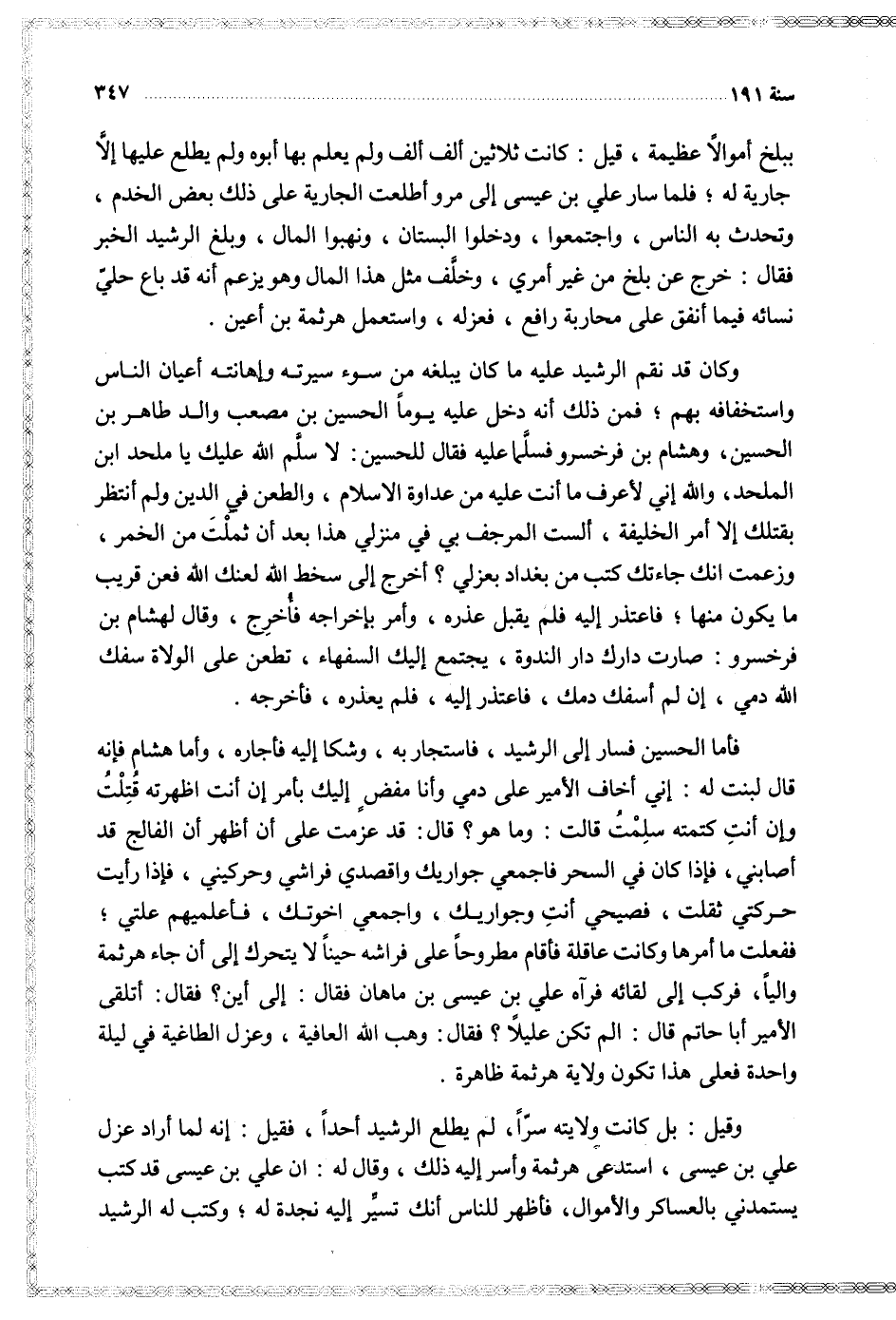 فأما الحسين فسار إلى الرشيد فاستجار به وشكا إليه فأجاره وأما هشام فإنه قال لبنت له إني أخاف الأمير على مدي وأنا مفض إليك بأمر إن أنت اظهرته قتلت وإن أنت كتمته سلمت قالت وما هو قال قد عزمت على أن أظهر أن الفالج قد أصابني فإذا كان في السحر فاجمعي جواريك واقصدي فراشي وحركيني فإذا رأيت حركتي ثقلت فصيحي أنت وجواريك واجمعهي اخوتك فأعلميهم علتي ففعلت ما أمرها وكانت عاقلة فأقام مطروحا على فراشه حينا لا يتحرك إلى أن جاء هرثمة واليا فركب إلى لقائه فرآه علي بن عيسى بن ماهان فقال إلى أين فقال أتلقى الأمير أبا حاتم قال الم تكن عليلا فقال وهب الله العافية وعزل الطاغية في ليلة واحدة فعلى هذا تكون ولاية هرثمة ظاهرة