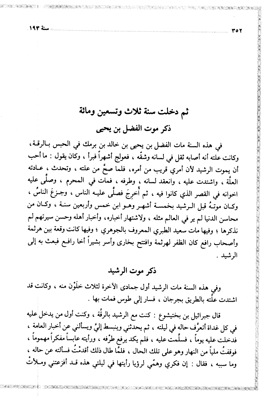 في هذه السنة مات الفضل بن يحيى بن خالد بن برمك في الحبس بالرقة وكانت علته أنه أصابه ثقل في لسانه وشقه فعولج أشهرا فبرأ وكان يقول ما أحب أن يموت الرشيد لأن أمري قريب من أمره فلما صح من علته وتحدث عادته العلة واشتدت عليه وانعقد لسانه وطرفه فمات في المحرم وصلى عليه اخوانه في القصر الذي كانوا فيه ثم أخرج فصلى عليه الناس وجزع الناس وكان موته قبل الرشيد بخمسة أشهر وهو ابن خمس وأربعين سنة وكان من محاسن الدنيا لم ير في العالم مثله ولاشتهار أخباره وأخبار أهله وحسن سيرتهم لم نذكرها وفيها مات سعيد الطبري المعروف بالجوهري وفيها كانت وقعة بين هرثمة وأصحاب رافع كان الظفر لهرثمة وافتتح بخارى وأسر بشيرا أخا رافع فبعث به إلى الرشيد