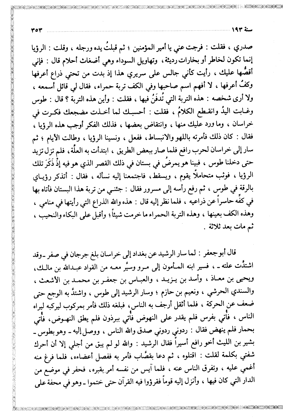 صدري فقلت فرجت عني يا أمير المؤمنين ثم قبلت يده ورجله وقلت الرؤيا إنما تكون لخاطر أو بخارات رديئة وتهاويل السوداء وهي أضغاث أحلام قال فإني أقصها عليك رأيت كأني جالس على سريري هذا إذ بدت من تحتي ذراع أعرفها وكف أعرفها لا افهم اسم صاحبها وفي الكف تربة حمراء فقال لي قائل أسمعه ولا أرى شخصه هذه التربة التي تدفن فيها فقلت وأين هذه التربة قال طوس وغابت اليد وانقطع الكلام فقلت أحسبك لما أخذت مضجعك فكرت في خراسان وما ورد عليك منها وانتقاض بعضها فذلك الفكر أوجب هذه الرؤيا فقال كان ذلك فأمرته باللهو والانبساط ففعل ونسينا الرؤيا وكالت الأيام ثم سار إلى خراسان لحرب رافع فما صار ببعض الطريق ابتدأت به العلة فلم تزل تزيد حتى دخلنا طوس فبينا هو يمرض في بستان في ذلك القصر الذي هو فيه إذ ذكر تلك الرؤيا فوثب متحاملا يقوم ويسقط فاجتمعنا إليه نسأله فقال أتذكر رؤياي بالرقة في طوس ثم رفع رأسه إلى مسرور فقال جئني من تربة هذا البستان فأتاه بها في كفه حاسرا عن ذراعيه فلما نظر إليه قال هذه والله الذراع التي رأيتها في منامي وهذه الكف بعينها وهذه التربة الحمراء ما خرمت شيئا وأقبل على البكاء والنحيب ثم مات بعد ثلاثة