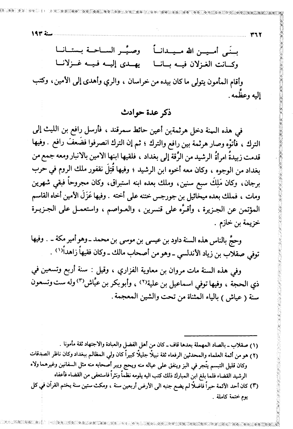 وفيها قدمت زبيدة امرأة الرشيد من الرقة إلى بغداد فلقيها ابنها الأمين بالانبار ومعه جمع من بغداد من الوجوه وكان معه أخوه ابن الرشيد وفيها قتل نقفور ملك الروم في حرب برجان وكان ملك سبع سنين وملك بعده ابنه استبراق وكان مجروحا فبقي شهرين ومات فملك بعده ميخائيل بن جورجس ختنه على أخته
