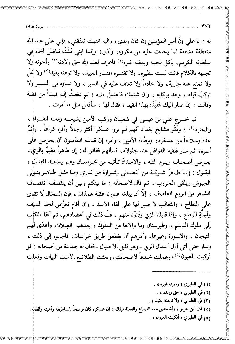 له يا علي إن أمير المؤمنين إن كان ولدي واليه انتهت شفقتي فإني على عبد الله منعطفة مشفقة لما يحدث عليه من مكروه وأذى وإنما ابني ملك نافس أخاه في سلطانه الكريم يأكل لحمه ويمقيه غيره فاعرف لعبد الله حق ولادته وأخوته ولا تجبهه بالكلام فانك لست بنظيره ولا تقتسره اقتسار العبيد ولا توهنه بقيد ولا غل ولا تمنع عنه جارية ولا خادما ولا تعنف عليه في السير ولا تساوه في المسير ولا تركب قبله وخذ بركابه وان شتمك فاحتمل منه ثم دفعت إليه قيدا من فضى وقالت إن صار اليك فقيده بهاذ القيد فقال لها يأفعل مثل ما أمرت