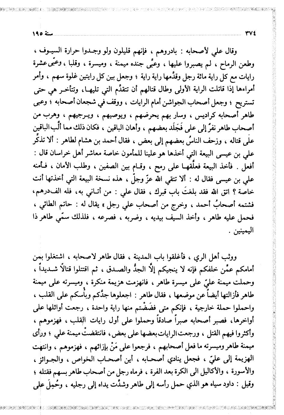 فأخذ البيعة فعلقها على رمح وقام بين الصفين وطلب الأمان فأمنه علي بن عيسى فقال له ألا تتقي الله عز وجل هذه نسخة البيعة التي أخذتها أنت خاصة اتق الله فقد بلغت باب قبرك فقال علي من أتاني به فله الف درهم فشتمه أصحاب محمد وخرج من أصحاب علي رجل يقال له حاتم الطائي فحمل عليه طاهر وأخذ السيف بيديه وضربه فصرعه فلذلك سمي طاهر ذا اليمينين