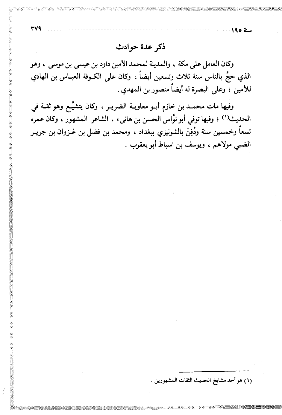 وفيها مات محمد بن خازم أبو معاوية الضرير وكان يتشيع وهو ثقة في الحديث وفيها توفي أبو نواس الحسن بن هانئ الشاعر المشهور وكان عمره تسعا وخمسين سنة ودفن بالشونيزي ببغداد ومحمد بن فضل بن غزوان بن جرير الضبي مولاهم ويوسف بن اسباط أبو يعقوب