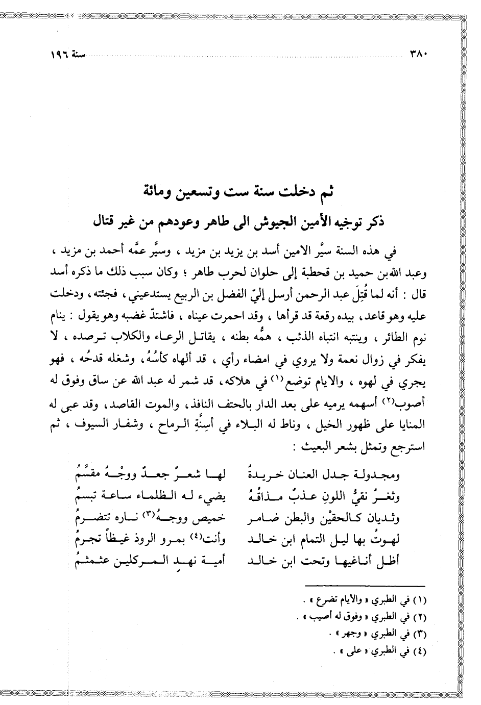 في هذهالسنة سن الامين أسد بم يزيد بن مزيد وسير عمه أحمد بن مزيد وعبد الله بن حميد بن قحطبة إلى حلوان لحرب طاهر وكان سبب ذلك ما ذكره أسد قال أنه لما قتل عبد الرحمن أرسل إلي الفضل بن الربيع يستدعيني فجئته ودخلت عليه وهو قاعد بيده رقعة وقد قرأها وقد احمرت عيناه فاشتد غضبه وهو يقول ينام نوم الطائر وينتبه انتباه الذئب همه بطنه يقاتل الرعاء والكلاب ترصده لا يفكر في زال نعمة ولا يروي في امضاء رأي قد ألهاه كأسه وشغله قدحه فهو يجزي في لهوه والايام توضع في هلاكه قد شمر له عبد الله عن ساق وفوق له أصوب أسهمه يرميه على بعد الدار بالحتف النافذ والموت القاصد وقد عبى له المنايا على ظهور الخيل وناط له البلاء في أسنة الرماح وشفار السيوف ثم استرجع وتمثل بشعر البعيث