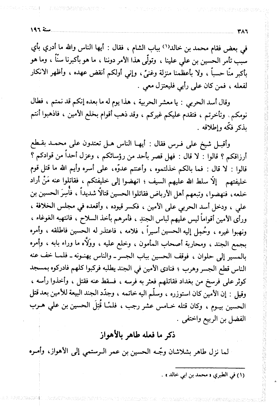 في بعض فقام محمد بن خالد بباب الشام فقال أيها الناس والله ما أدري بأي سبب تأمر الحسين بن علي علينا وتولى هذا الأمر دوننا ما هو بأكبرنا سنا وما هو بأكبر منا حسبا ولا بأعظمنا منزلة وغنى وإني أولكم أنقض عهده وأظهر الانكار لفعله فمن كان على رأيي فليعتزل معي
