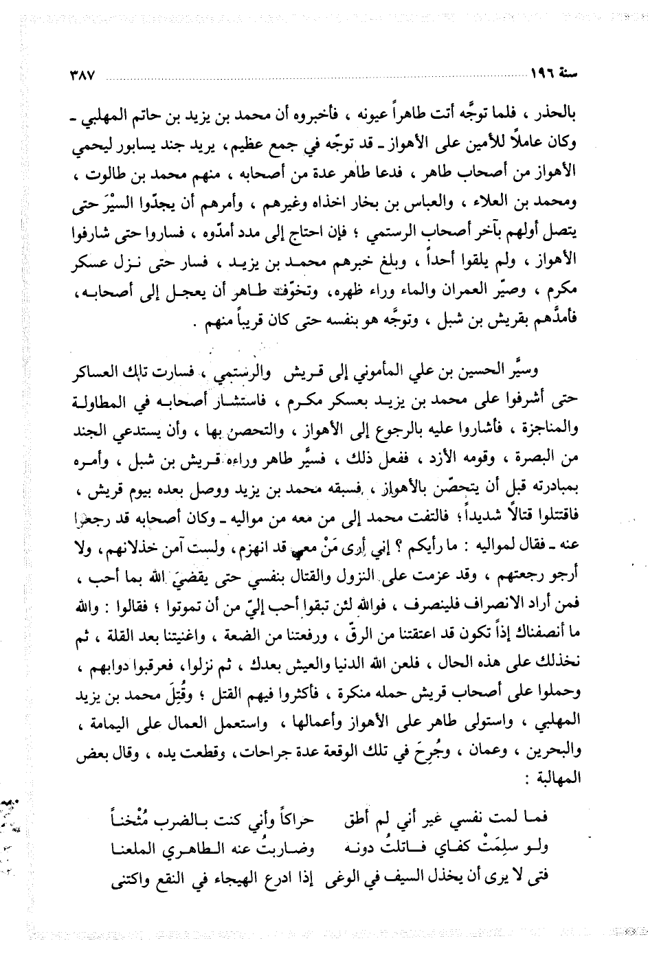 وسير الحسين بن علي المأموني إلى قريش والرستمي فسارت تلك العساكر حتى أشرفوا على محمد بن يزيد بعسكر مكرم فاستشار أصحابه في المطاولة والمناجزة فأشاروا عليه بالرجوع إلى الأهواز والنحصن نبها وأن يستعدي الجند من البصرة وقومه الأزد ففعل ذلك فسير طاهر وراءه قريش بن شبل وأمره بمبادرته قبل أن يتحصن بالأهواز فسبقه محمد بن يزيد ووصل بعده بيوم قريش فاقتتلوا قتالا شديدا فالتفت محمد إلى من معه من مواليه وكان أصحابه قد رجعوا معه فقال لمواليه ما رأيكم إني أرى من معي قد انهزم ولست آمن خذلانهم ولا أرجو رجعتهم وقد عزمت على النزول والقتا بنفسي حتى يقضي الله بما أحب فمن أراد الانصراف فلينصرف فوالله لئن تبقوا أحب إلي من أن تموتوا فقالوا والله ما أنصفناك إذا تكون قد اعتقتنا من الرق ورفعتنا من الضعة واغنيتنا بعد القلة ثم نخذلك على هذه الحال فلعن الله الدنيا والعيش بعدك ثم نزلوا فعرقبوا دوابهم وحملوا على أصحاب قريش حمله منكرة فأكثروا فيهم القتل وقتل محمد بن يزيد المهلبي واستولى طاهر على الأهواز وأعمالها واستعمل العمال على اليمامة والبحرين وعمان وجرح في تلك الوقعة عدة جراحات وقطعت يده وقال بعض المهالبة