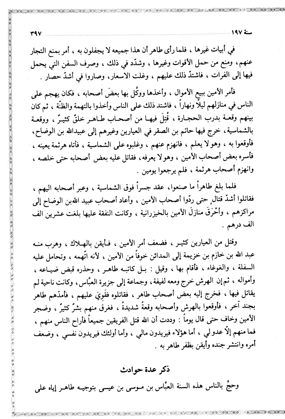 في أبيات غيرها فلما رأى طاهر أن هذا جميعه لا يجفلون به أمر منع التجار عنهم ومنع من حمل الأقوات وغيرها وشدد في ذلك وصرف السفن التي حمل فيها إلى الفرات فاشتد ذلك عليهم وغلت الأسعار وصاروا في أشد حصار