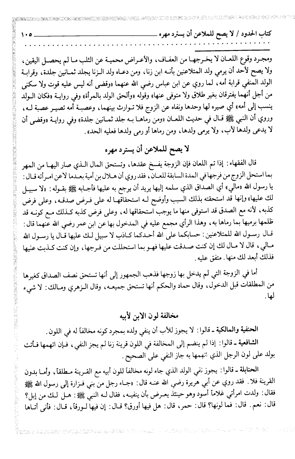 ومجرد وقوع اللعان لا يخرجها من العفاف، والأعراض محمية عن الثلب ما لم يحصل اليقين، ولا يصح لأحد أن يرمي ولد المتلاعنين بأنه أبن زنا، ومن دعاه ولد الزنا يجلد ثمانين جلدة، وقرابة الولد المنفي قرابة أمه، لما روي عن أبن عباس رضي الله عنهما (وقضى أنه ليس عليه قوت ولا سكنى من أجل أنهما يفترقان بغير طلاق ولا متوفى عنها) وقول (وألحق الولد بالمرأة) وفي رواية (فكان الولد ينسب إلى أمه) أي صيره لها وحدها ونفاه عن الزوج فلا توارث بينهما، وعصبة أمه تصبر عصبة له، وروي أن النبّي صلى الله عليه وسلم قال في حديث اللعان (ومن رماها به جلد ثمانين جلد) وفي رواية (وقضى أن لا يدعى ولدها لأب، ولا يرمى ولدها، ومن رماها أو رمى ولها فعليه الحد) .