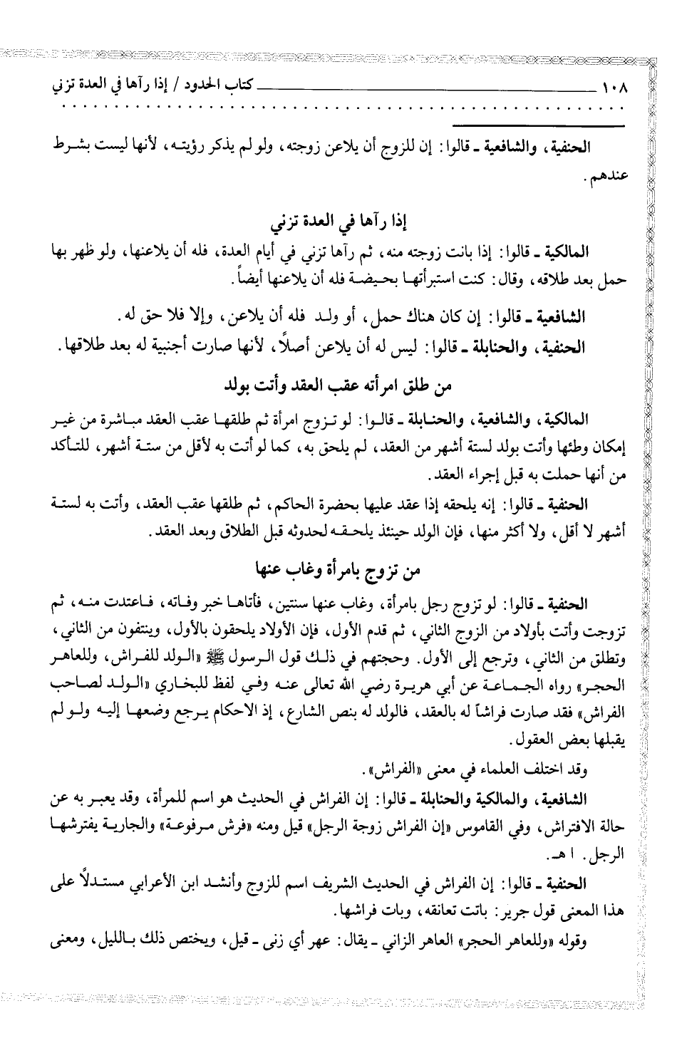 الحنيفية - قالوا: لو تزوج رجل بامرأة، وغاب عنها سنتين، فأتاها خبر وفاته، فاعتدت منه، ثم تزوجت وأتت بأولاد من الزوج الثاني، ثم قدم الأول. وحجتهم في ذلك قول الرسول صلى الله عليه وسلم (الولد للفراش، وللعاهر الحجر) رواه الجماعة عن أبي هريرة رضي الله تعالى عنه وفي لفظ للبخاري (الولد لصاحب الفراش) فقد صارت فراشاً له بالعقد، فأولده بنص الشارع، إذ الإحكام يرجع وضعها إليه ولو لم يقبلها بعض العقول.