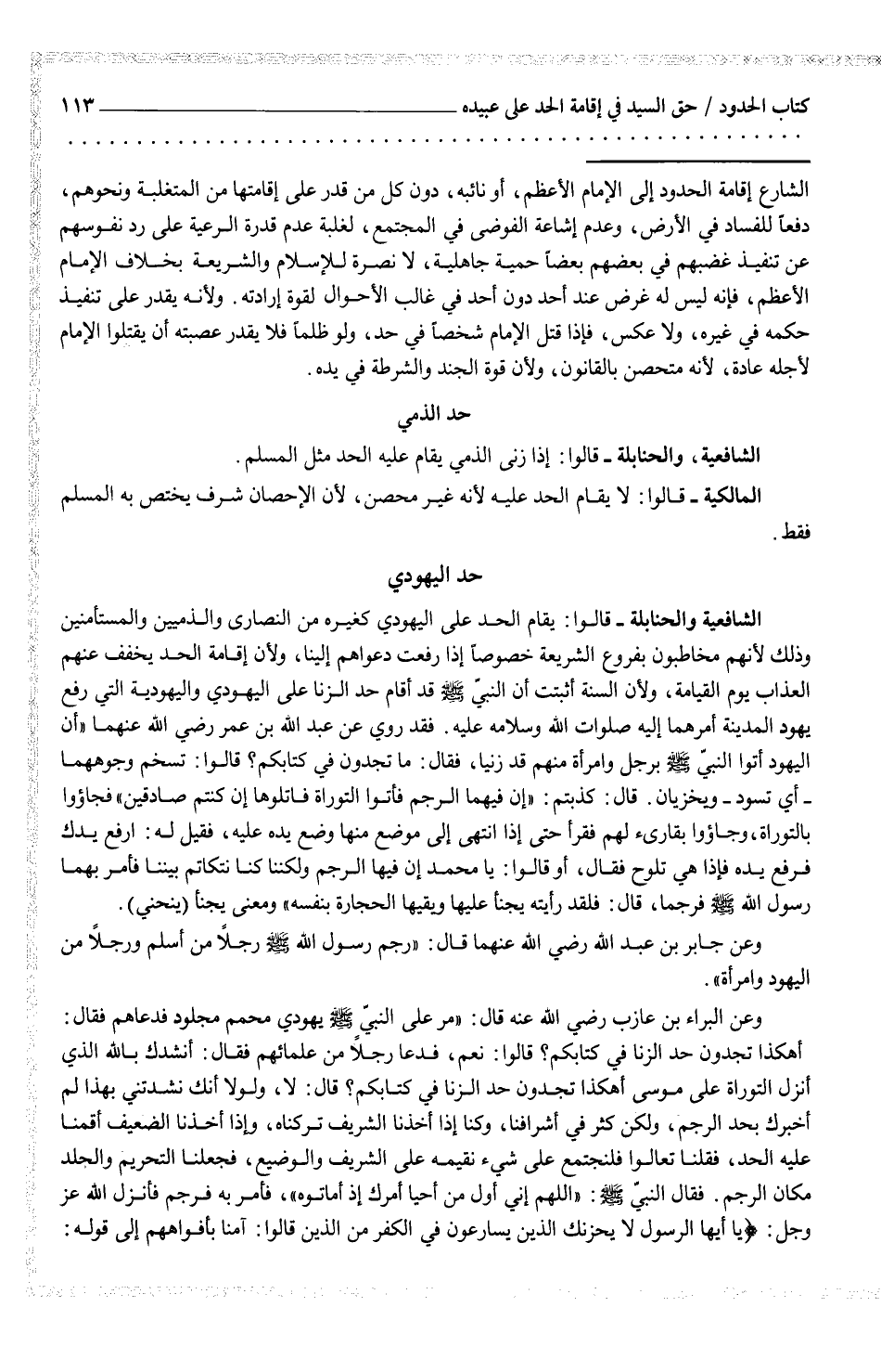 الشافعية والحنابلة - قالوا: يقام الحد على اليهودي كغيره من النصارى والذميين والمستأمنين وذلك لأنهم مخاطبون بفروع الشريعة خصوصاً إذا رفعت دعواهم إلينا، ولأن إقامة الحد يخفف عنهم العذاب يوم القيامة، ولأن السنة أثبتت أن النبّي صلى الله عليه وسلم قد أقام حد الزنا على اليهودي واليهودية التي رفع يهود المدينة أمرهما إليه صلوات الله وسلامه عليه. فقد روي عن عبد الله بن عمر رضي الله عنهما (أن اليهود أتوا النبّي صلى الله عليه وسلم برجل وامرأة منهم قد زنيا، فقال: ما تجدون في كتابكم؟ قالوا: تسخم وجوههما - أي تسود - ويخزيان. قال: كذبتم: (إن فيهما الرجم فأتوا التوراة فاتلوها إن كنتم صادقين) فجاؤوا بالتوراة، وجاؤوا بقارئ لهم فقرأ حتى إذا انتهى إلى موضع منها وضع يده عليه، فقيل له: ارفع يدك فرفع يده فإذا هي تلوح فقال، أو قالوا: يا محمد إن فيها الرجم ولكننا كنا نتكاتم بيننا فأمر بهما رسول الله صلى الله عليه وسلم فرجما، قال: فلقد رأيته يجنأ عليها ويقيها الحجارة بنفسه) ومعنى يجيأ (ينحني) .