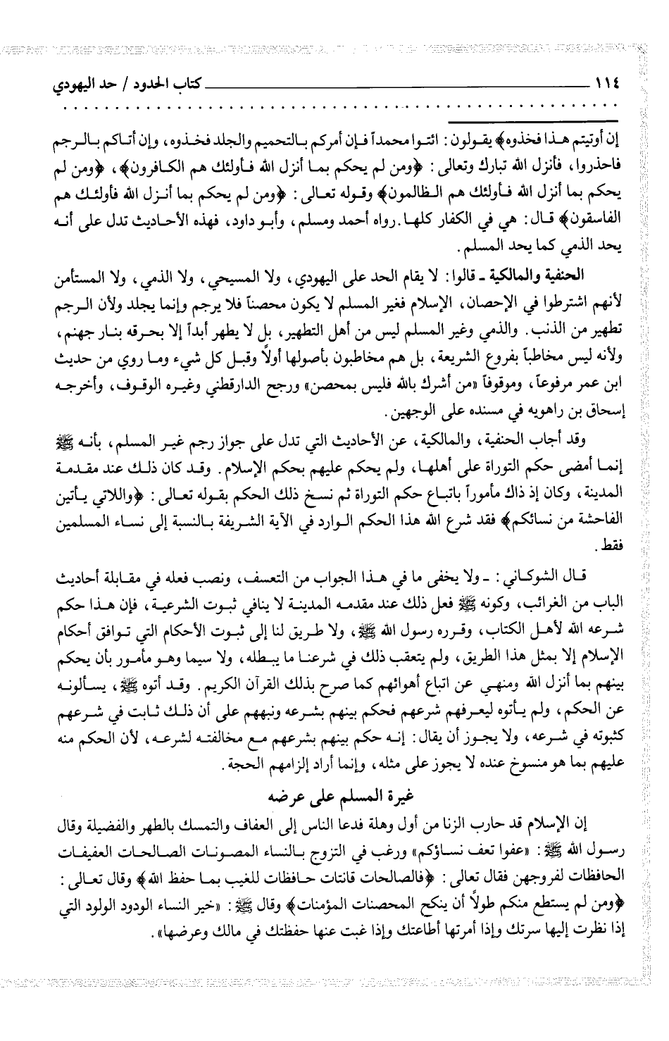 قال الشوكاني: - ولا يخفى ما في هذا الجواب من التعسف، ونصب فعله في مقابلة أحاديث الباب من الغرائب، وكونه صلى الله عليه وسلم فعل ذلك عند معدمه المدينة لا ينافي ثبوت الرعية، فإن هذا حكم شرعه الله لهل الكتاب، وقرره رسول الله صلى الله عليه وسلم، ولا طريق لنا إلى ثبوت الحكام التي توافق أحكام الإسلام إلا بمثل هذا الطريق، ولم يتعقب ذلك في شرعنا ما يبطله، ولا سيما وهو مأمور بأن يحكم بينهم بما أنزل الله ومنهي عن اتباع أهوائهم كما صرح بذلك القرآن الكريم. وقد أوه صلى الله عليه وسلم، يسألونه عن الحكم، ولم يأتوه ليعرفهم شرعهم فحكم بينهم بشرعه ونبههم على أن ذلك ثابت في شرعهم كثبوته في شرعه، ولا يجوز أن يقال: إنه حكم بينهم بشرعهم مع مخالفته لشرعه، لأن الحكم منه عليهم بما هو منسوخ عنده لا يجوز على مثله، وإنما أراد إلزامهم الحجة.