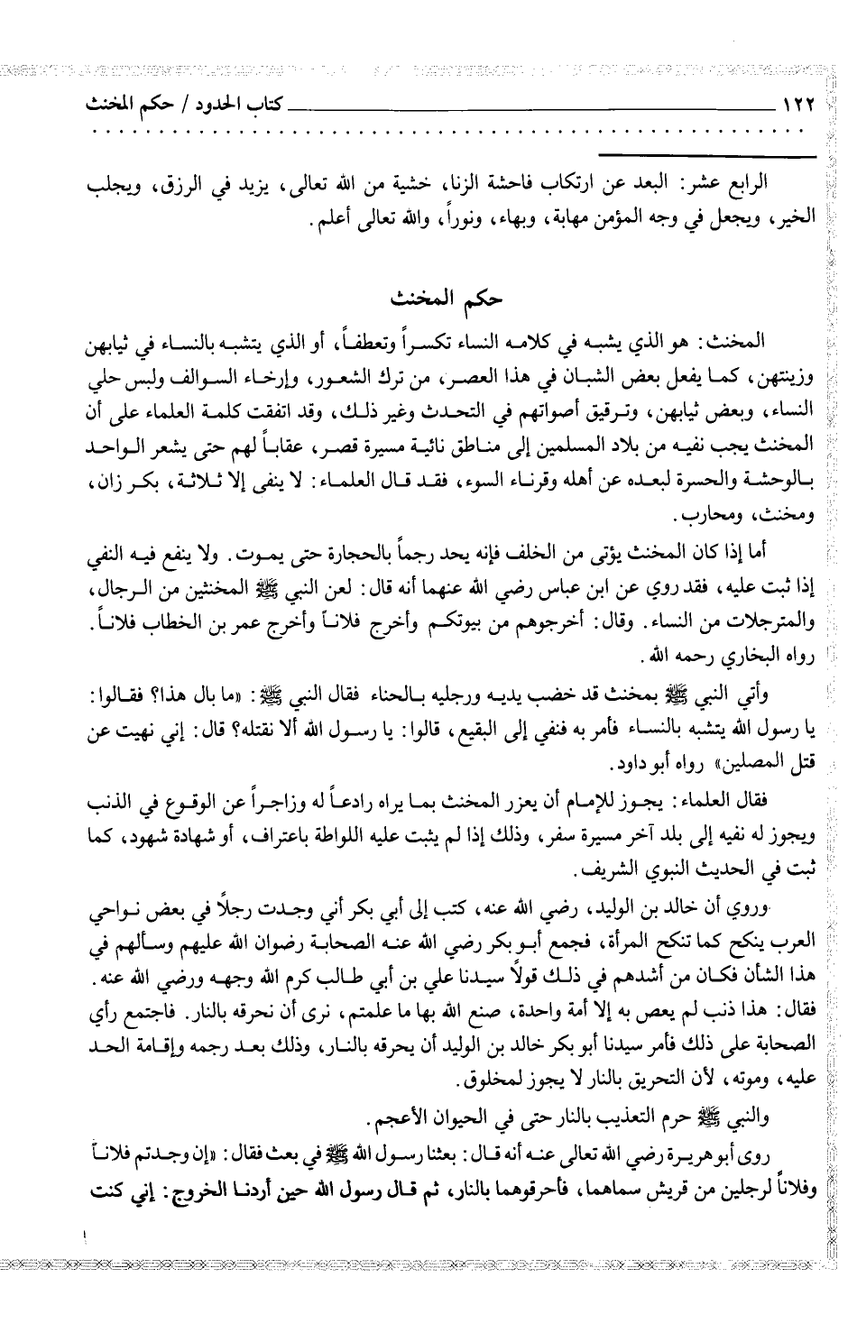 المخنث: هو الذي يشبه في كلامه النساء تكسراً وتعطفاً، أو الذي يتشبه بالنساء في ثيابهن وزينتهن، كما يفعل بعض الشبان في هذا العصر، من ترك الشعور، وإرخاء السوالف ولبس حلي النساء، وبعض ثيابهن، وترقيق أصواتهم في التحدث وغير ذلك، وقد اتفقت كلمة العلماء على أن المخنث يجب نفيه من بلاد المسلمين إلى مناطق نائية مسيرة قصر، عقاباً لهم حتى يشعر الواحد بالوحشة والحسرة لبعده عن أهله وقرناء السوء، فقد قال العلماء: لا ينفى إلا ثلاثة، بكر زان، ومخنث، ومحارب. أما إذا كان المخنث يؤتى من الخلف فإنه يحد رجماً بالحجارة حتى يموت. ولا ينفع فيه النفي إذا ثبت عليه، فقد روي عن أبن عباس رضي الله عنهما أنه قال: لعن النبي صلى الله عليه وسلم المخنثين من الرجال، والمترجلات من النساء. وقال: أخرجوهم من بيوتكم واخرج فلاناً واخرج عمر بن الخطاب فلاناً رواه البخاري رحمه الله.