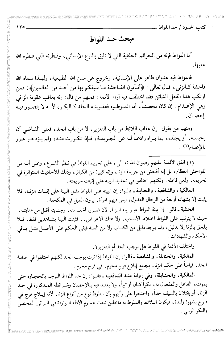 (¬1) (اتفق الأئمة عليهم رضوان الله تعالى، على تحريم اللواط في نظر الشرع، وعلى أنه من الفواحش العظام، بل إنه لأفحش من جريمة الزنا، وإنه كبيرة من الكبائر، وذلك للأحاديث المتواترة في تحريمه، ولعن فاعله. ولكنهم اختلفوا في تحديد البينة على إثبات جريمته.