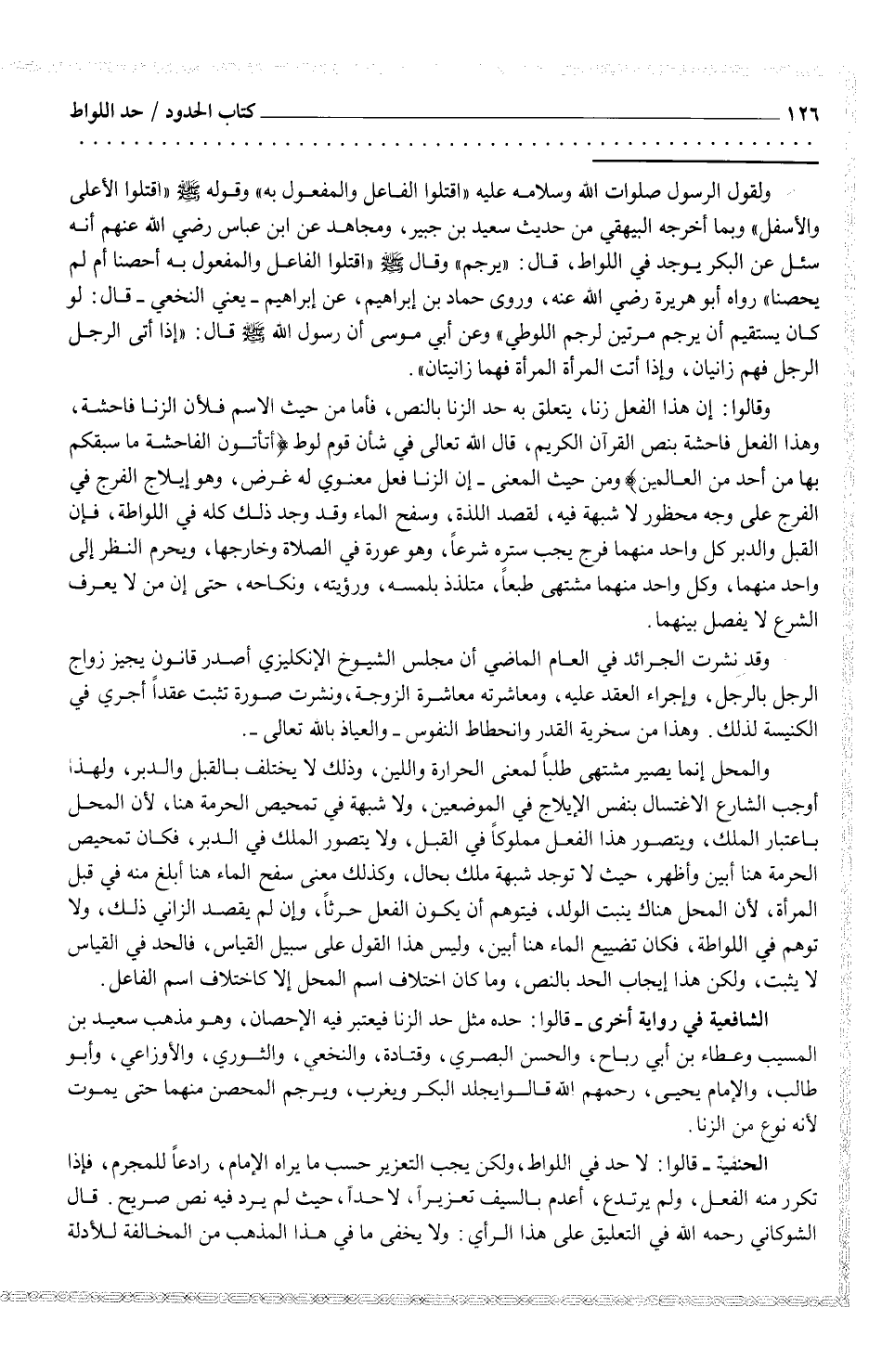 ولقول الرسول صلوات الله وسلامه عليه (اقتلوا الفاعل والمفعول به) وقول صلى الله عليه وسلم (اقتلوا الأعلى والأسفل) وبما أخرجه البيهقي من حديث سعيد بن جبير، ومجاهد عن أبن عباس رضي الله عنهم أنه سئل عن البكر يوجد في اللواط، قال: (يرجم) وقال صلى الله عليه وسلم (اقتلوا الفاعل والمفعول به أحصنا أم لم يحصنا) رواه أبو هريرة رضي الله عنه، وروى حماد بن إبراهيم، عن إبراهيم - يعني النخعي - قال: لو كان يستقيم أن يرجم مرتين لرجم اللوطي) وعن أبي موسى أن رسول الله صلى الله عليه وسلم قال: (إذا أتى الرجل الرجل فهم زانيان، وإذا أتت المرأة المرأة فهما زانيتان) .