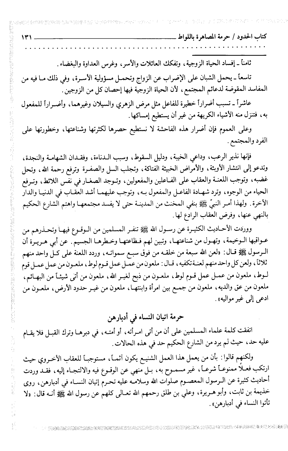 ولكنهم قالوا: بأن من يعمل هذا العمل الشنيع يكون آثماً، مستوجباً للعقاب الأخروي حيث ارتكب فعلاً ممنوعاً شرعاً، غير مسموح بهن بل منهي عن الوقوع فيه والالتجاء إليه، فقد وردت أحاديث كثيرة عن الرسول المعصوم صولات الله وسلامه عليه تحرم إتيان النساء في أدبارهنن روى خذيمة بن ثابت، وأبو هريرة، وعلي بن طلق رحمهم الله تعالى كلهم عن رسول الله صلى الله عليه وسلم أنه قال: (لا تأتوا النساء في أدبارهن) .